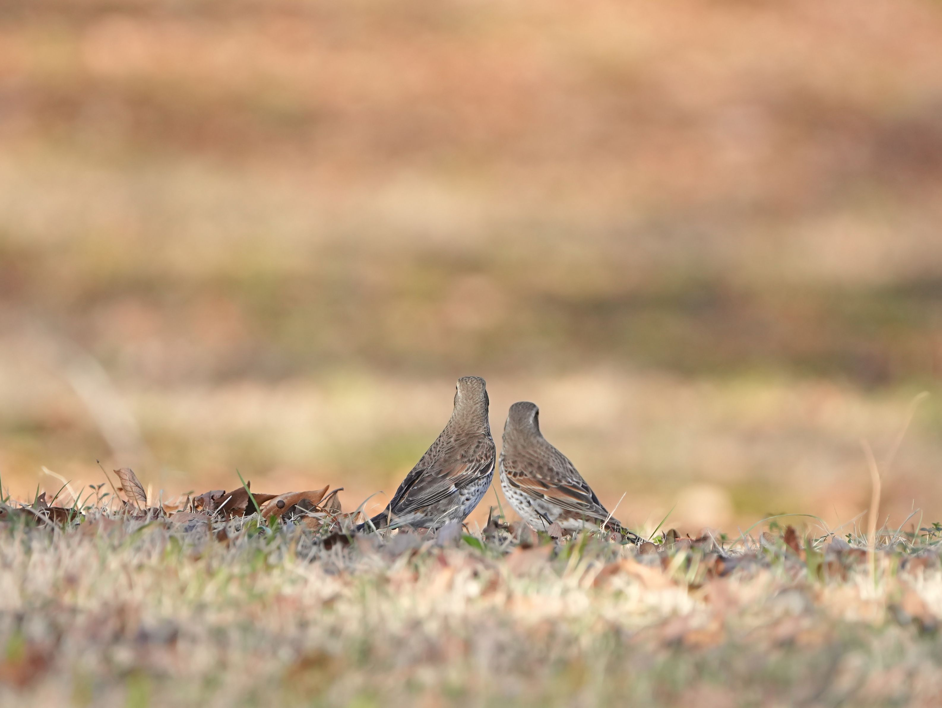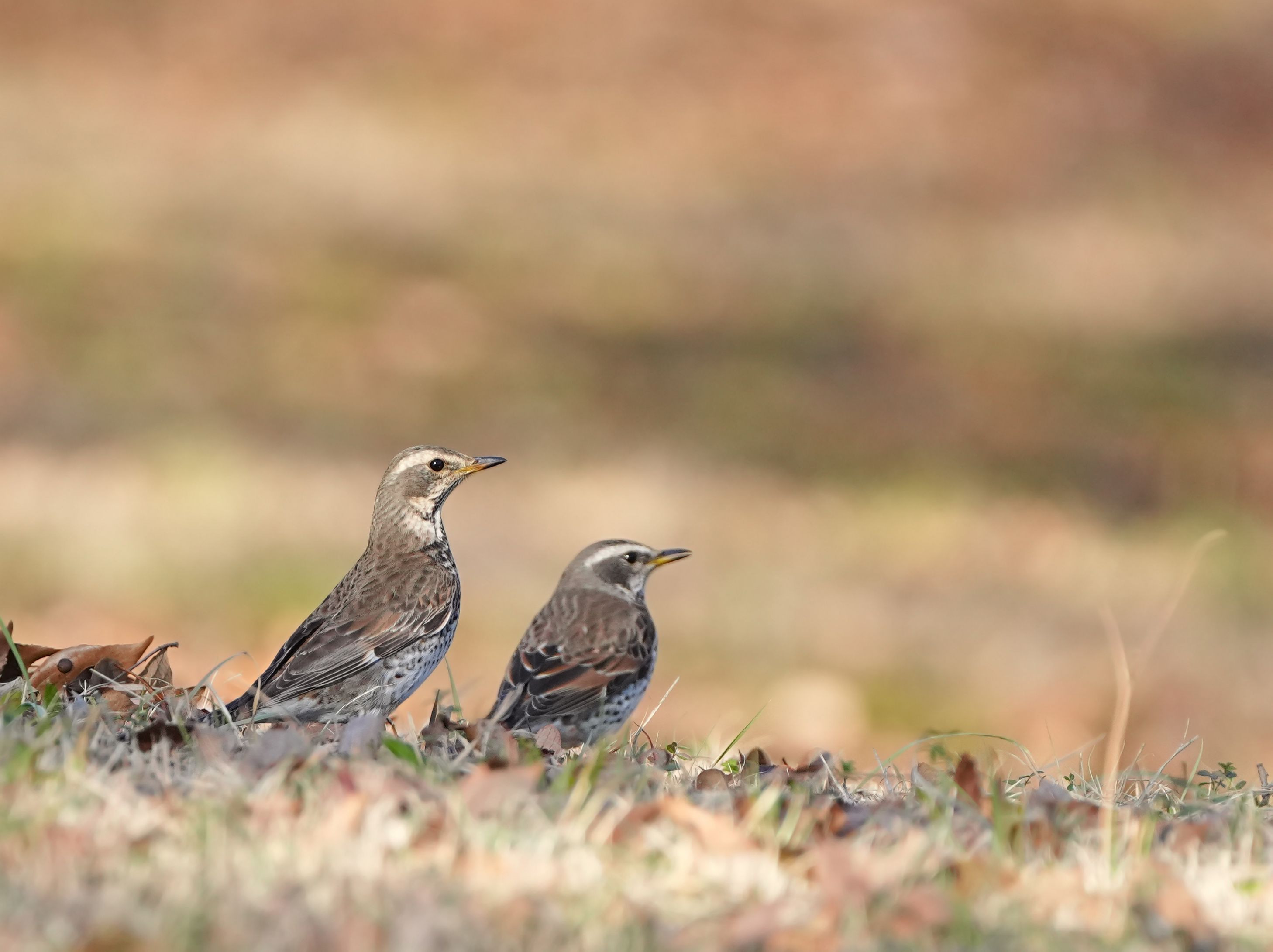 芝生で目についた2羽のツグミ 右の子は左の子より少し後ろにいたので2羽同時にピントは来ませんでしたが、なんか寄り添っているようでほっこり。2枚目は動きもシンクロしていました