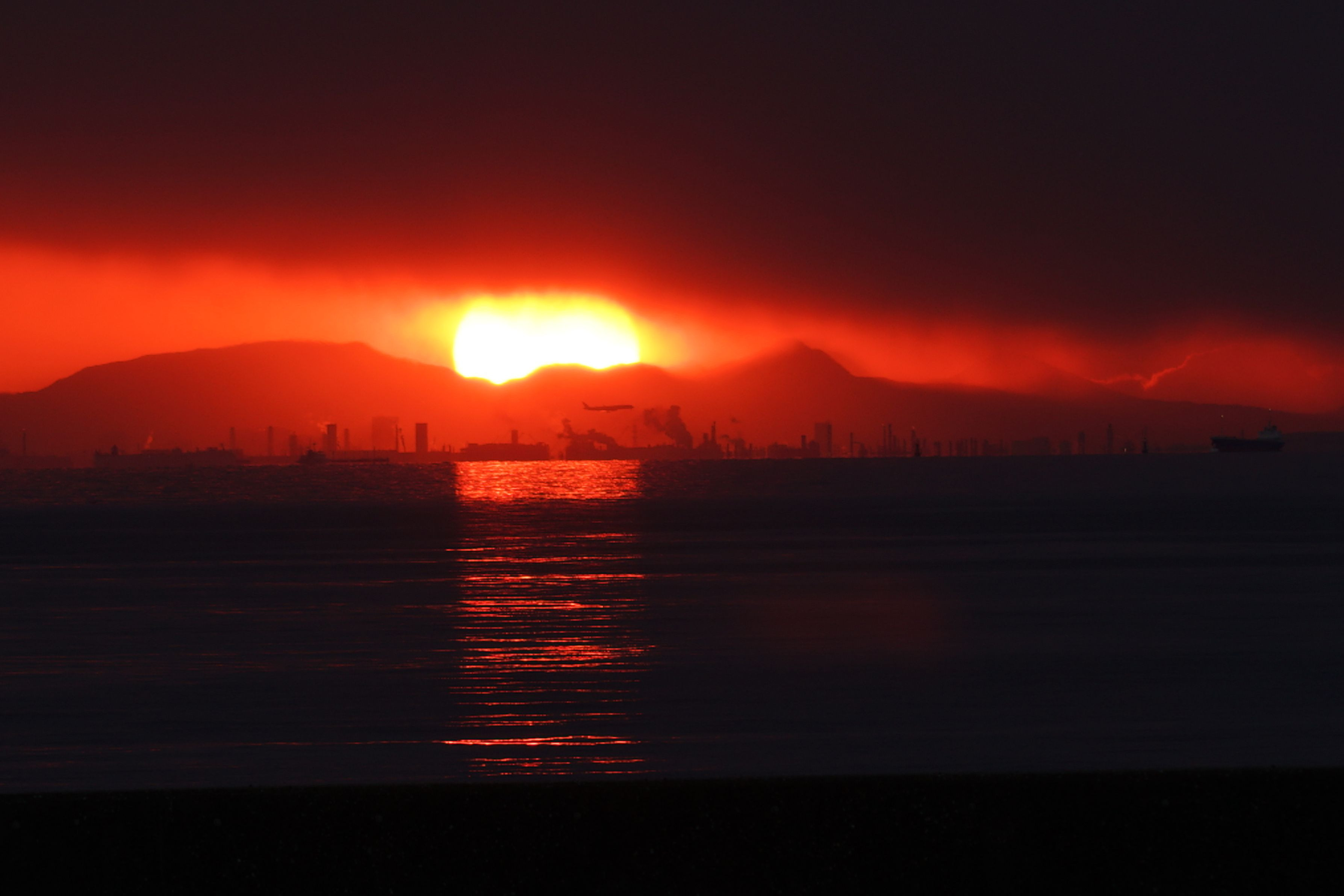 黒く雪雲かと思われる厚い雲 そのあい間に沈む夕陽がまぶしい 機影も登場