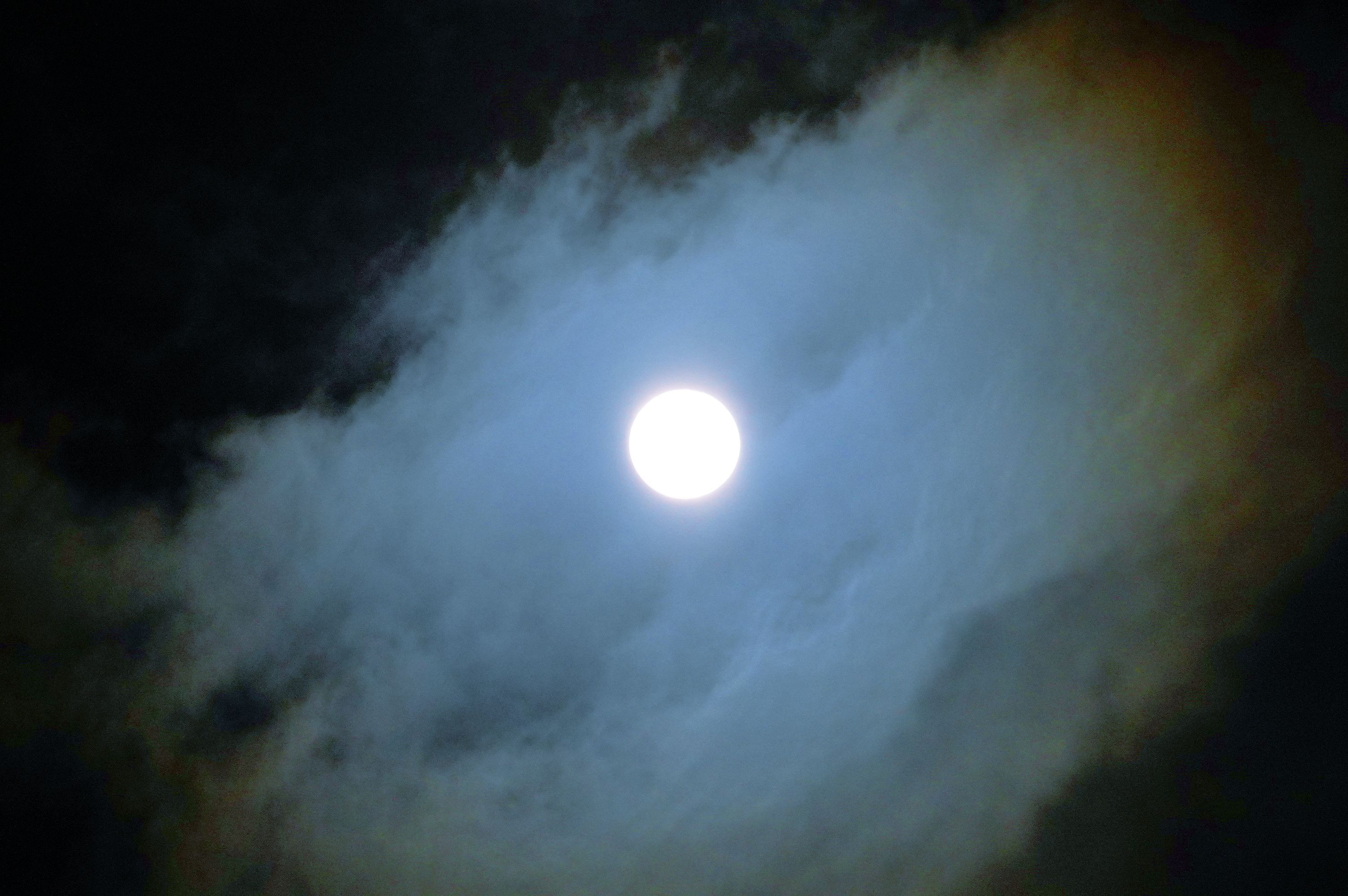満月時刻は2日AM7:09。このお月様は21時頃(14時間後)撮影です。雲の切れ間を狙ってみました(´;ω;`)。2月の満月はスノームーン。ピント拡大中のAF