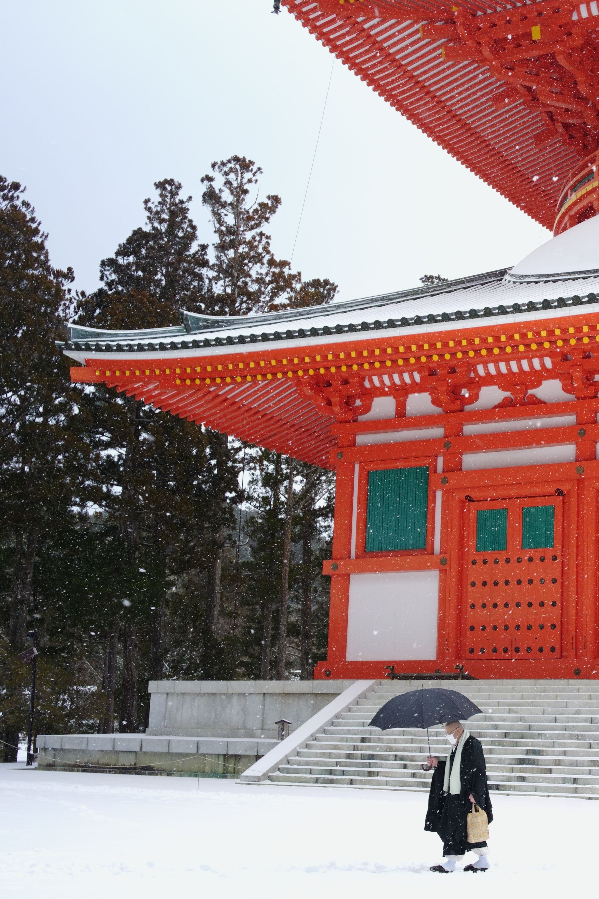 雪の高野山壇上伽藍・根本大塔前を横切る僧侶です 写真にはあまり写ってませんが、雪が降ってます