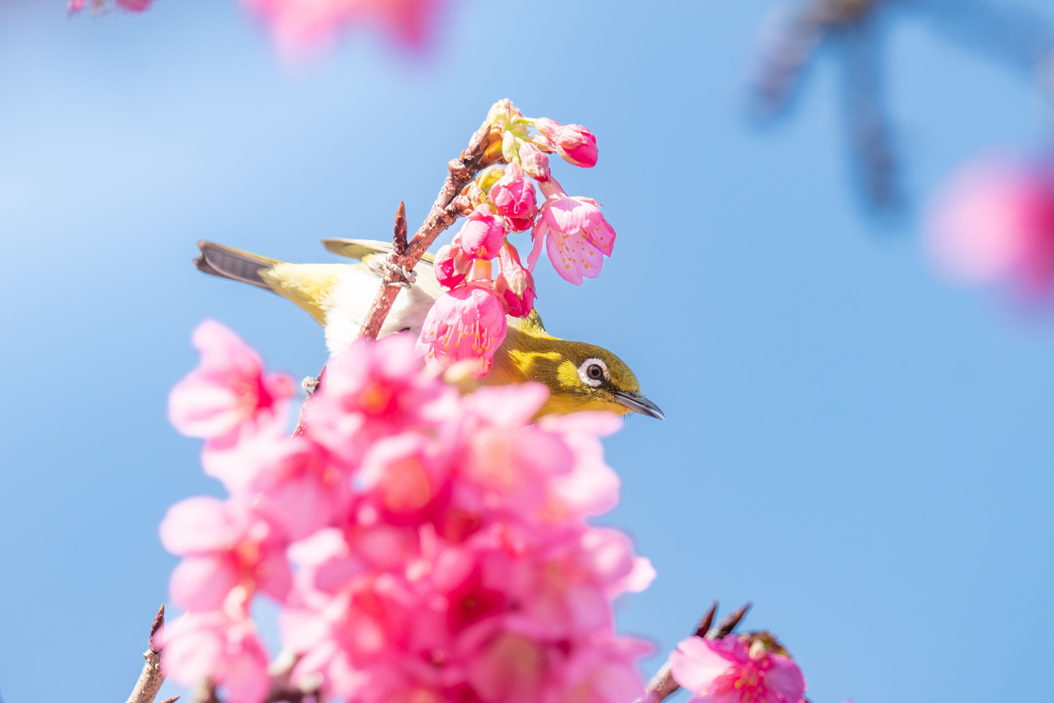 一月後半からすでに咲き始めている沖縄の桜とメジロの写真です。 この時期は天気が悪いので、晴れた日を待ち続けました。