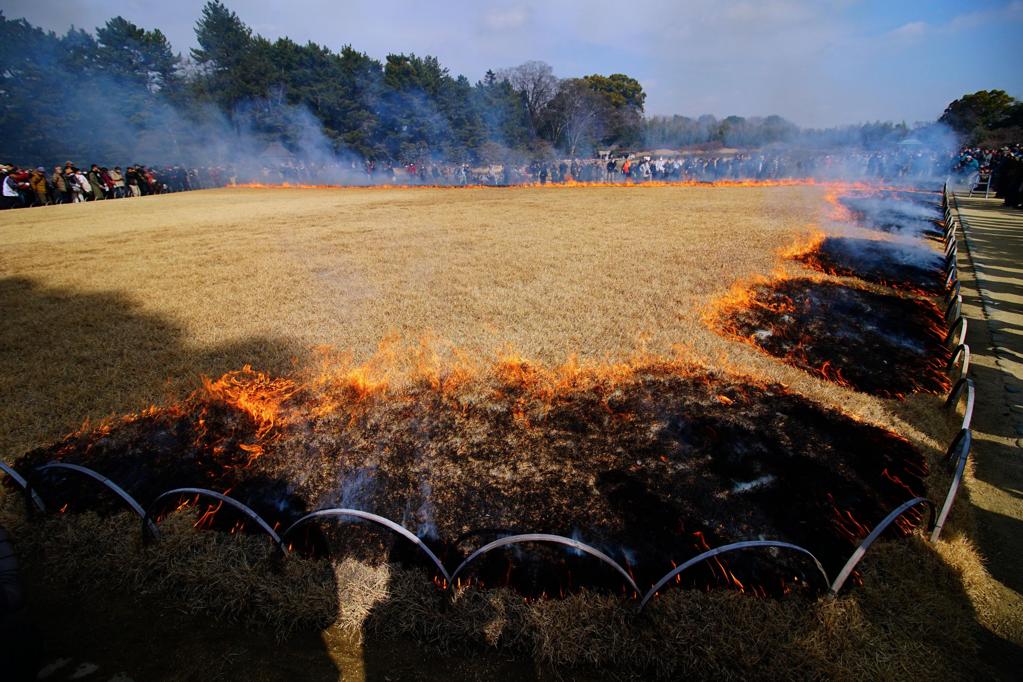 令和8年2月4日(水曜日) 後楽園 「芝焼き」 13時~15時頃 約1.8ヘクタール(約5,500坪) 園内に広く敷かれた芝を順番に焼いていく「芝焼き」を行います