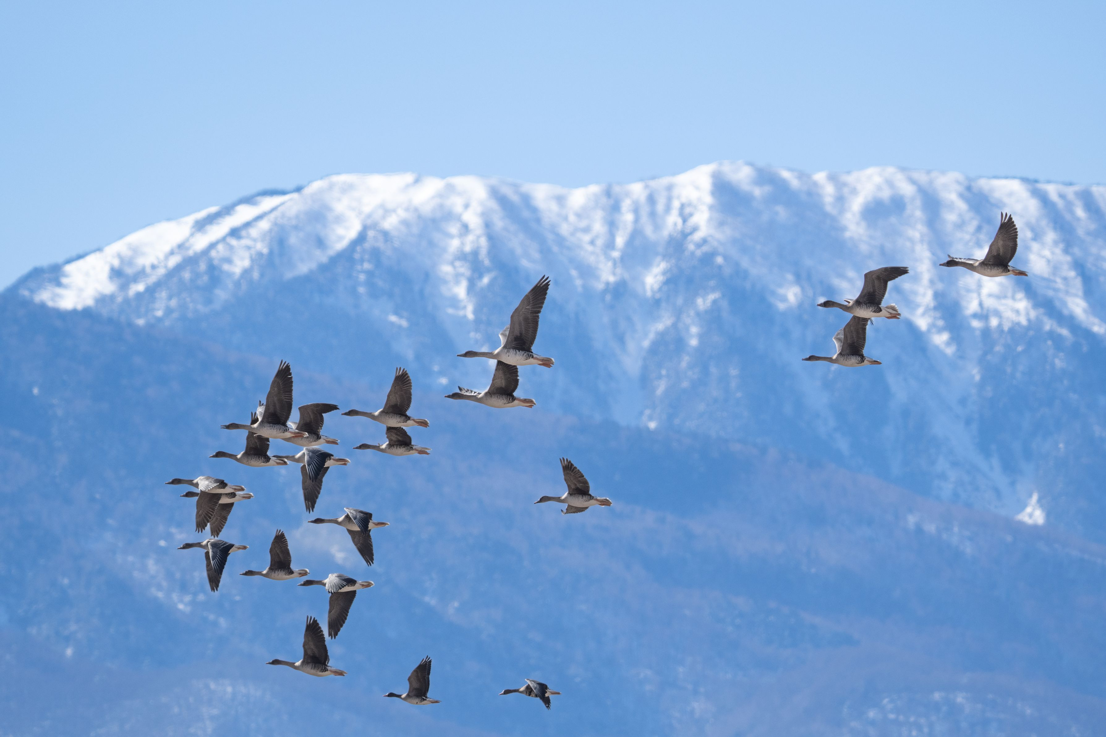 オオヒシクイ24羽、マガン2羽の群れが北アルプスを 背景にして飛んでくれました。・・が全部入りませんでした。