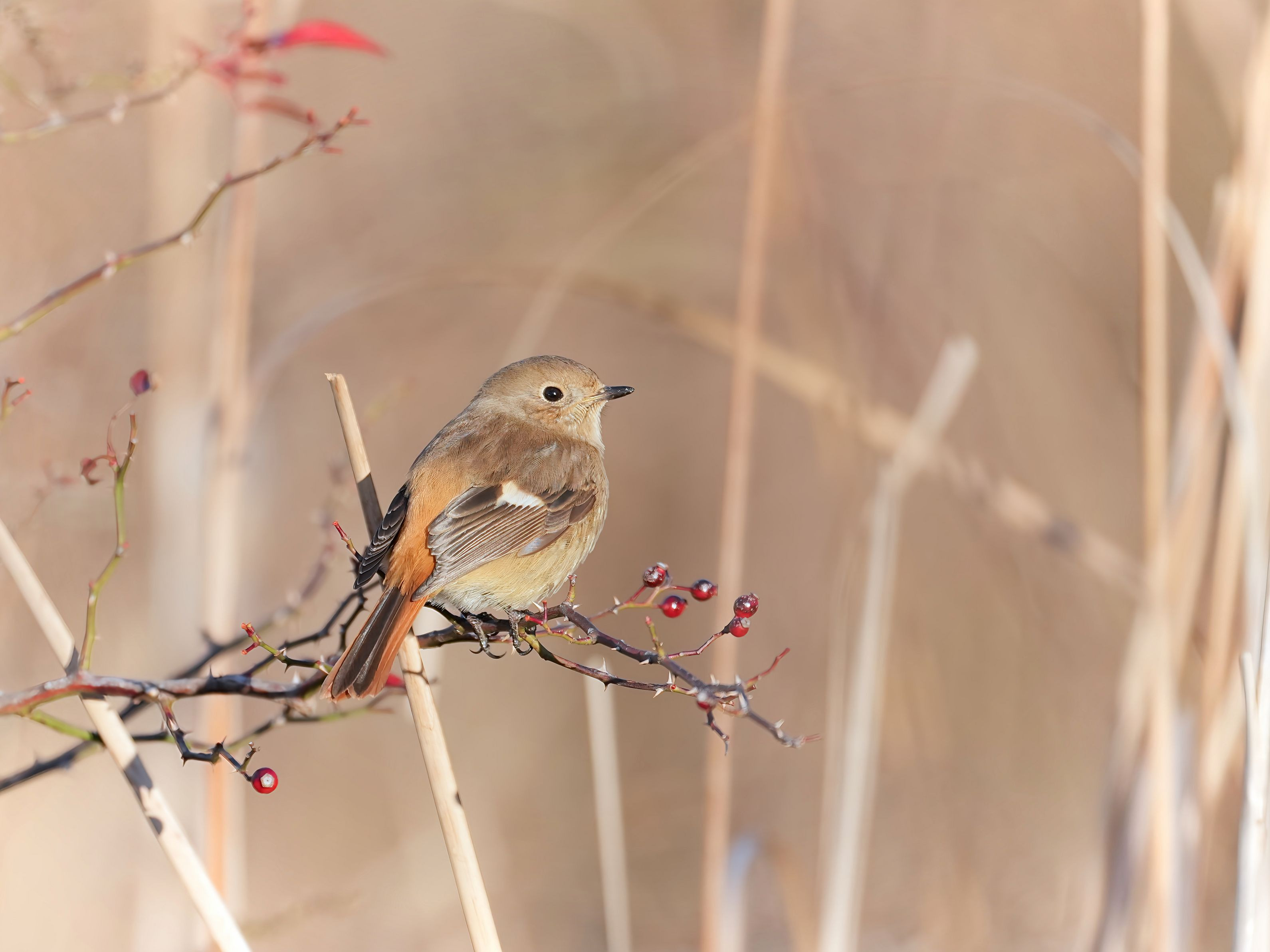 2026年1月 ジョウビタキがノイバラに止まってくれました✨ 実は美味しくないのか食べていませんでした(;^ω^) 今年はジョウビタキの女の子が少ない気がします…。 #ジョウビタキ#