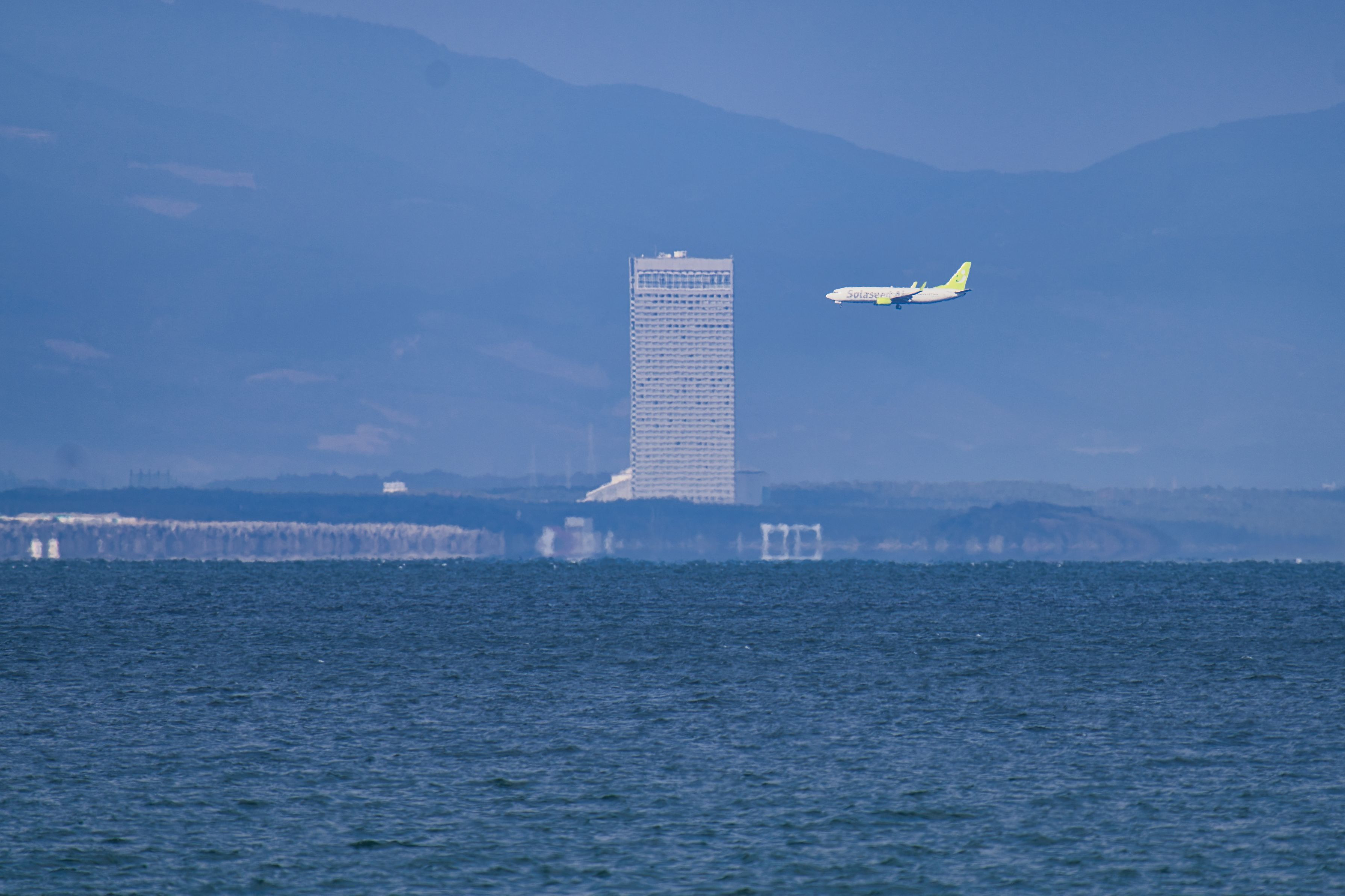 青島から見えるフェニックス・シーガイア・オーシャン・タワーの手前を、空港へ着陸していくソラシドエアのBoeing 737