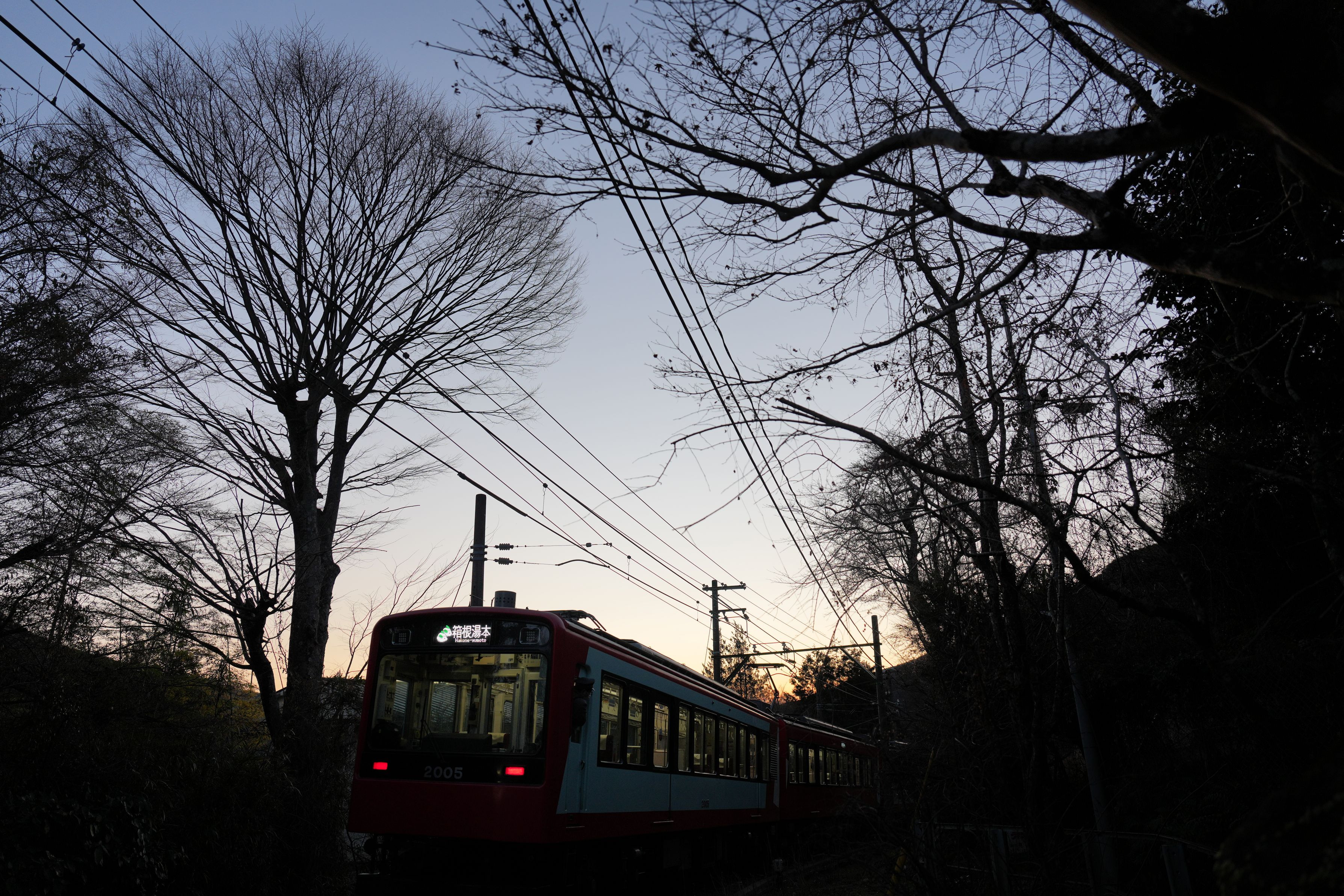 夜明け間近の静まり返った冬の朝。箱根湯本行きの登山電車が静かに急坂を下って行きました。