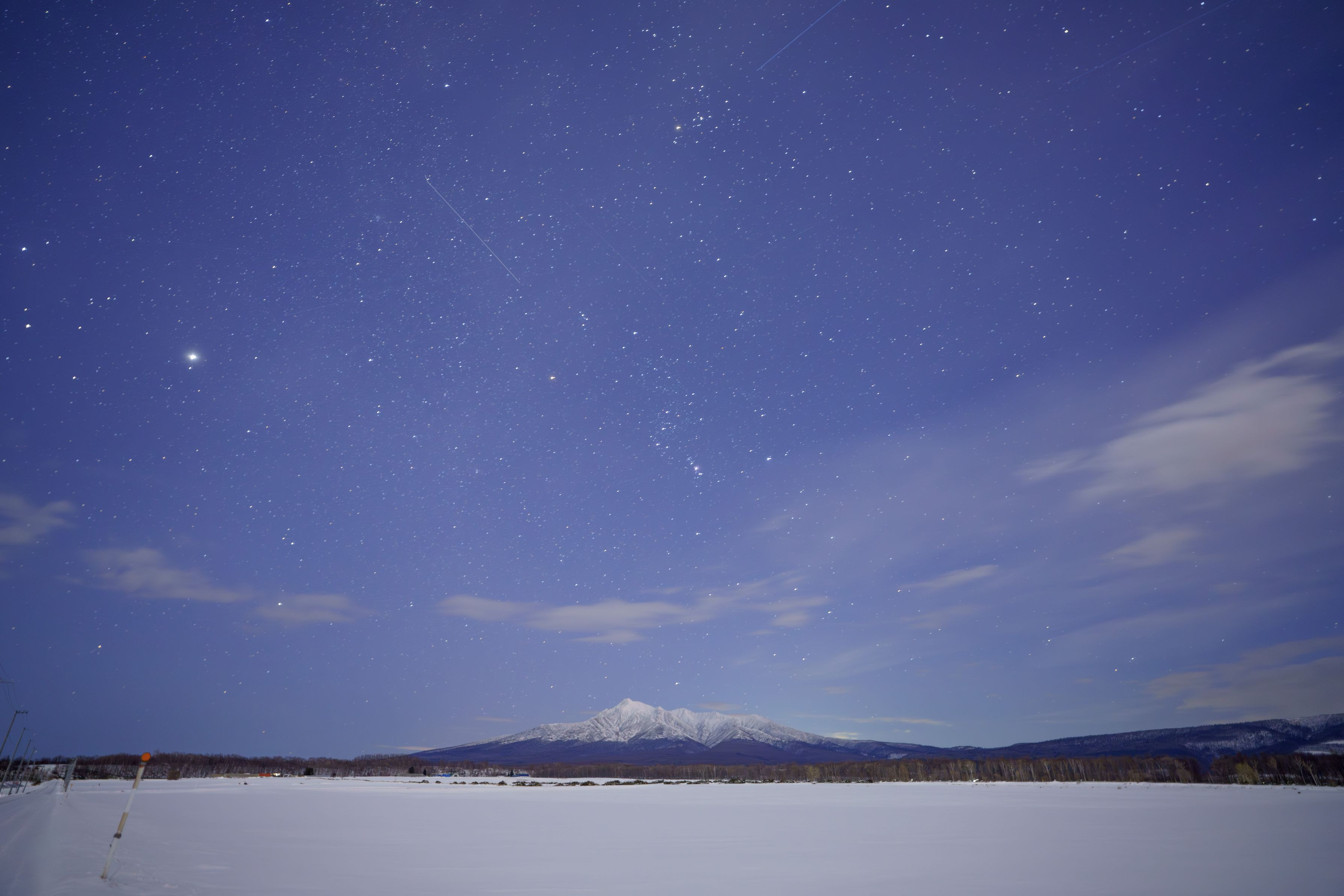 斜里岳の麓で星を捉えてみました。肉眼では気づかなかったのですが、流れ星も撮れていました。