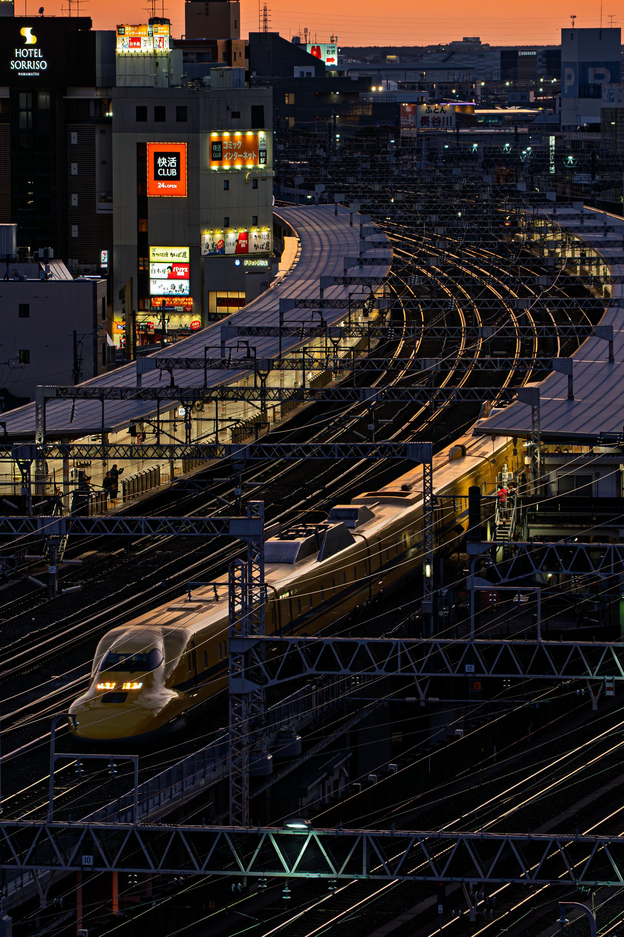 夕焼けの名残がレールを赤銅色に染める頃、ドクターイエローが浜松駅を静かに発っていきました。見送る人々の気配と街の灯りが混じり始める時間帯。残照に照らされた線路と黄色い車体の重なりを写しとめました。 被写体:ドクターイエロー T5編成 こだま検測上り 撮影日:2026/2/3 撮影地:浜松駅 カメラ:SONY α9 (初代) レンズ:SIGMA 20-200mm F3.5-6.3 DG