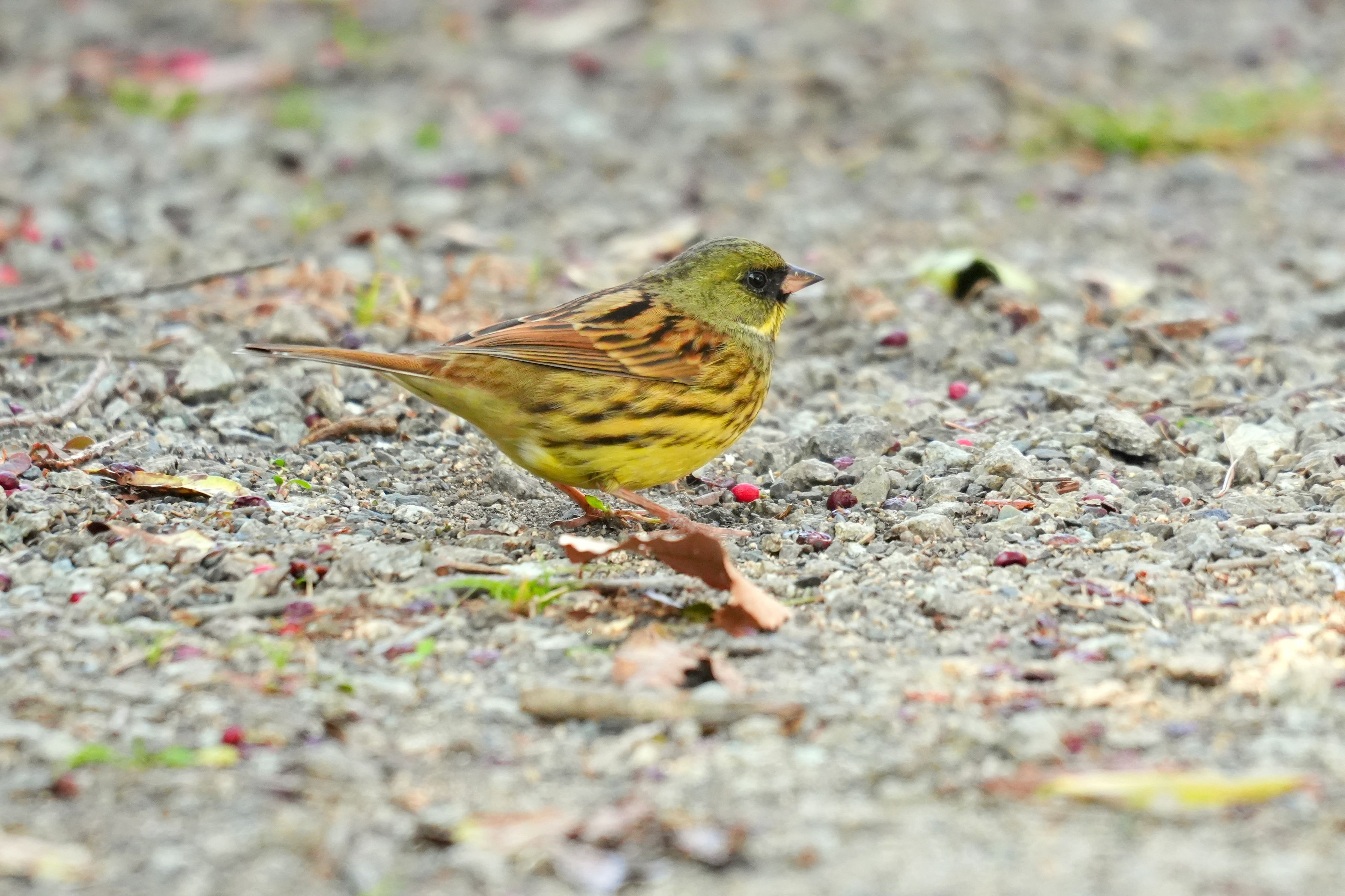 地面をぴょんぴょんハネながら食べ物を探すアオジさん