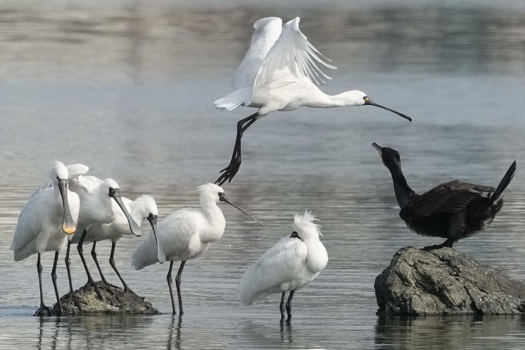 前景から約1時間が経過して潮が上がり、磯が水没しつつあります。クロツラ一家はもっと大きな磯に退避を開始。 一番左にヘラサギを交えた混成の一家を見守るカワウが印象的です。 #クロツラヘラサギ#、#ヘラサギ#、#カワウ#