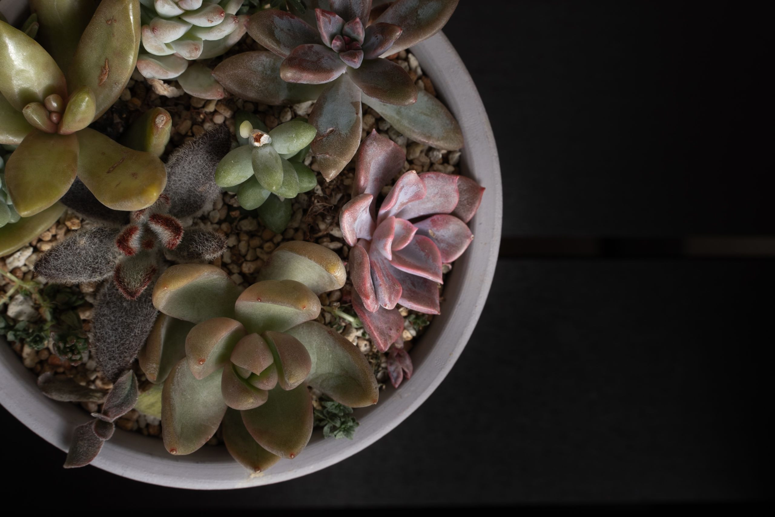多肉寄せ植えの可愛いけど少し不気味な印象を左上配置の構図で表現しました。背景には極々うっすらと棚板を中心線として残しています。