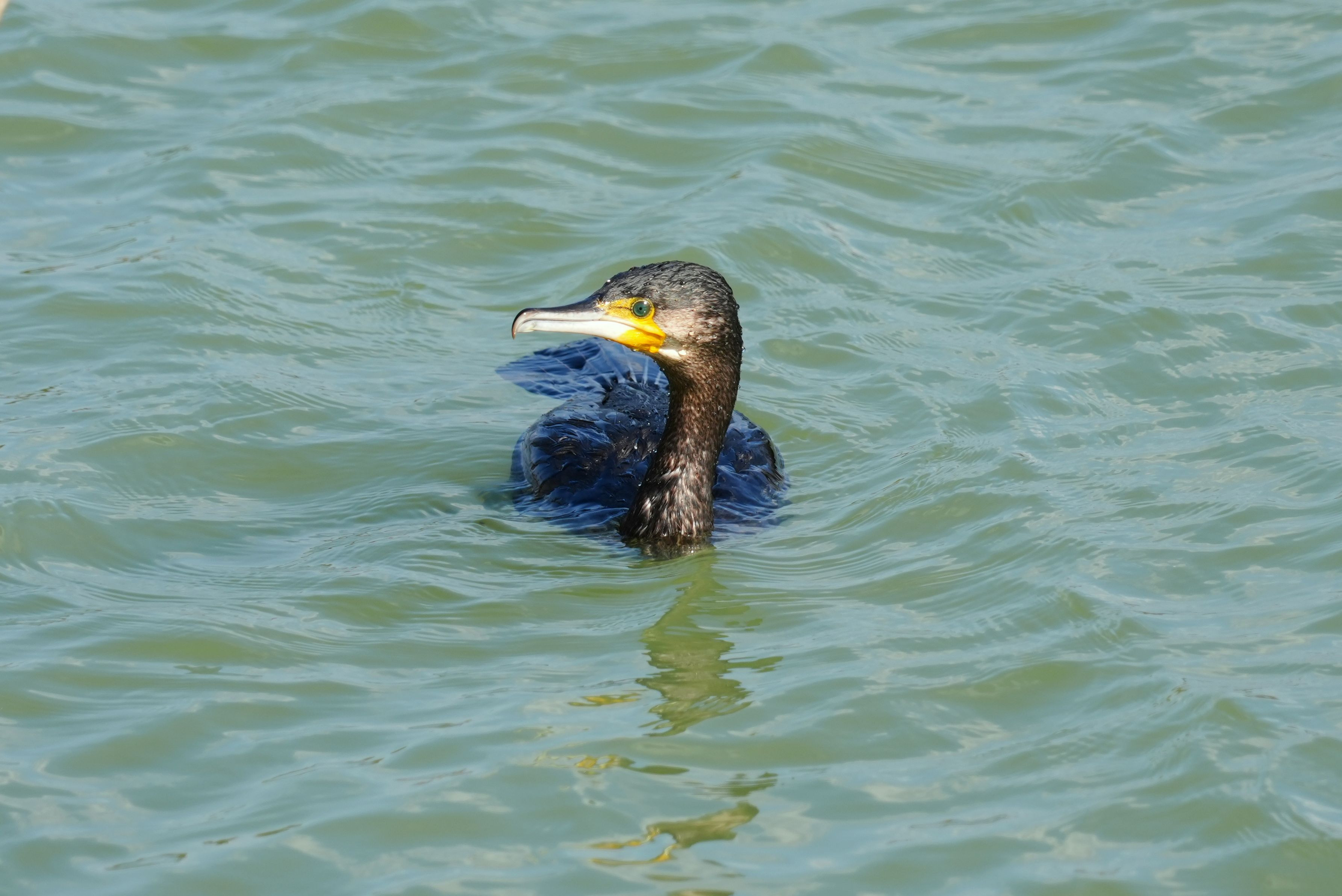 池で何度も潜り食べ物を探していたカワウ