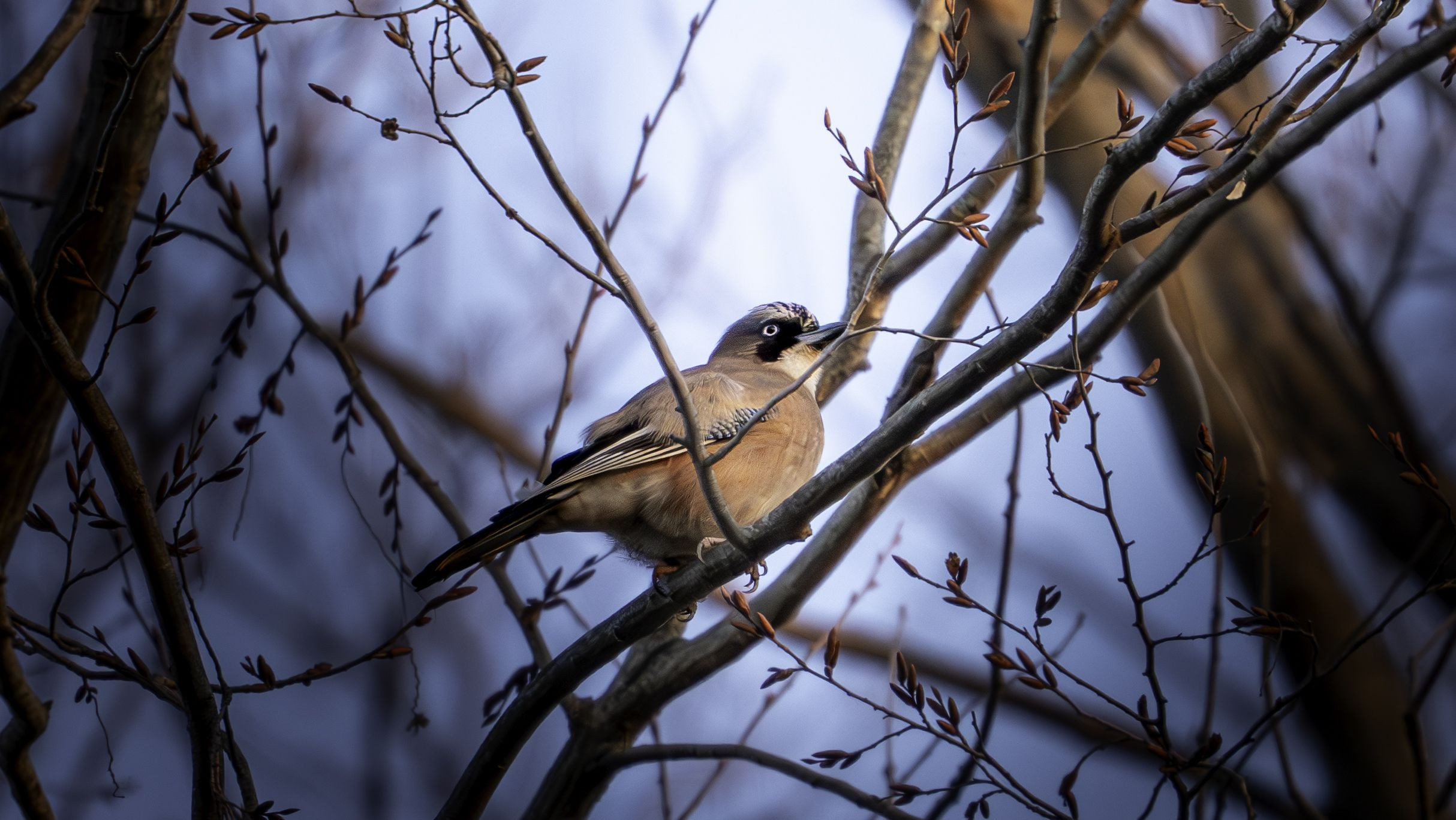 会ってみたかった野鳥の一羽、カケスさん✨ 朝焼けの早朝に出てきてくれました! 羽のカラーリングといい、目つきといい、 とっても格好よかったです!