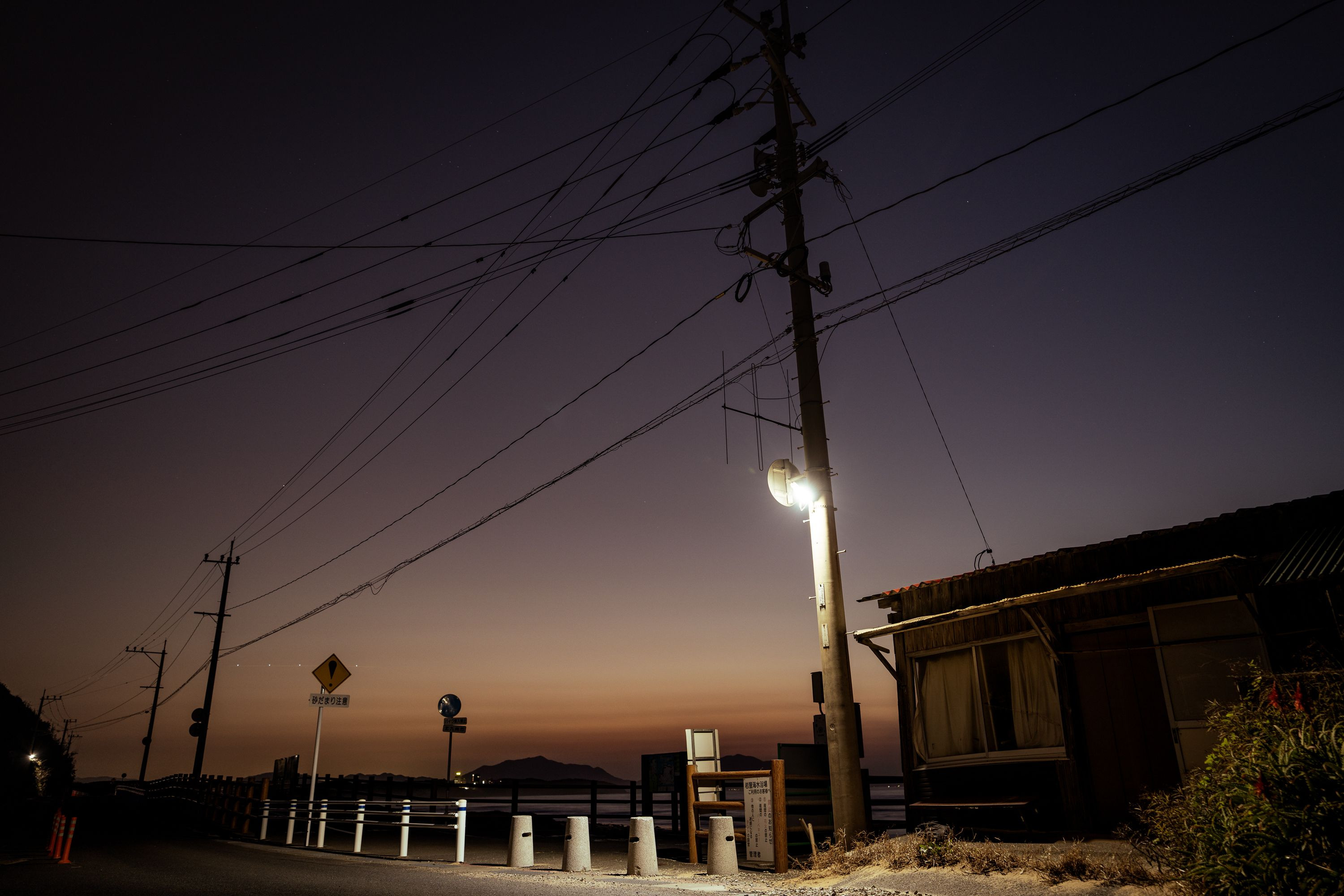 夕陽を見るいつもの海岸 暗くなっても照らしてくれる常夜灯はずっと前からあった