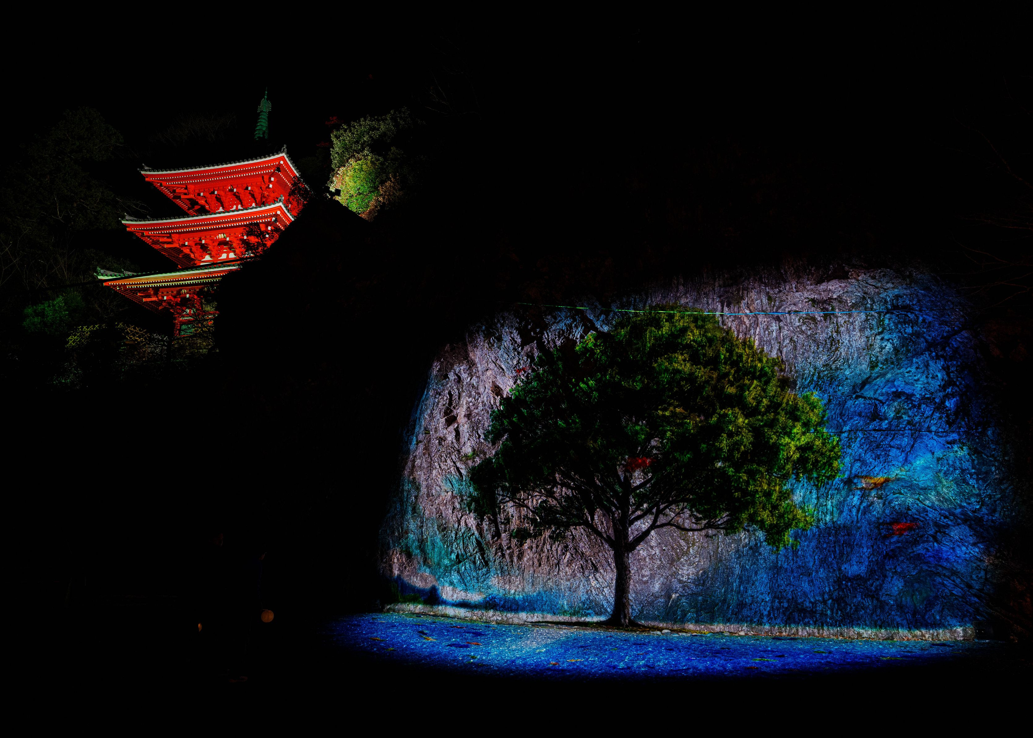国登録有形文化財 岐阜公園三重塔の麓にある崖一面に、大迫力のプロジェクションマッピングが繰り広げられました。「生命の樹」をモチーフにした鮮やかな演出が崖一面を彩りました。崖一面に広がる大迫力のプロジェクションマッピングで鮮やかに彩られ、まるで絵画のように表情を変えていく姿は感動的でした。