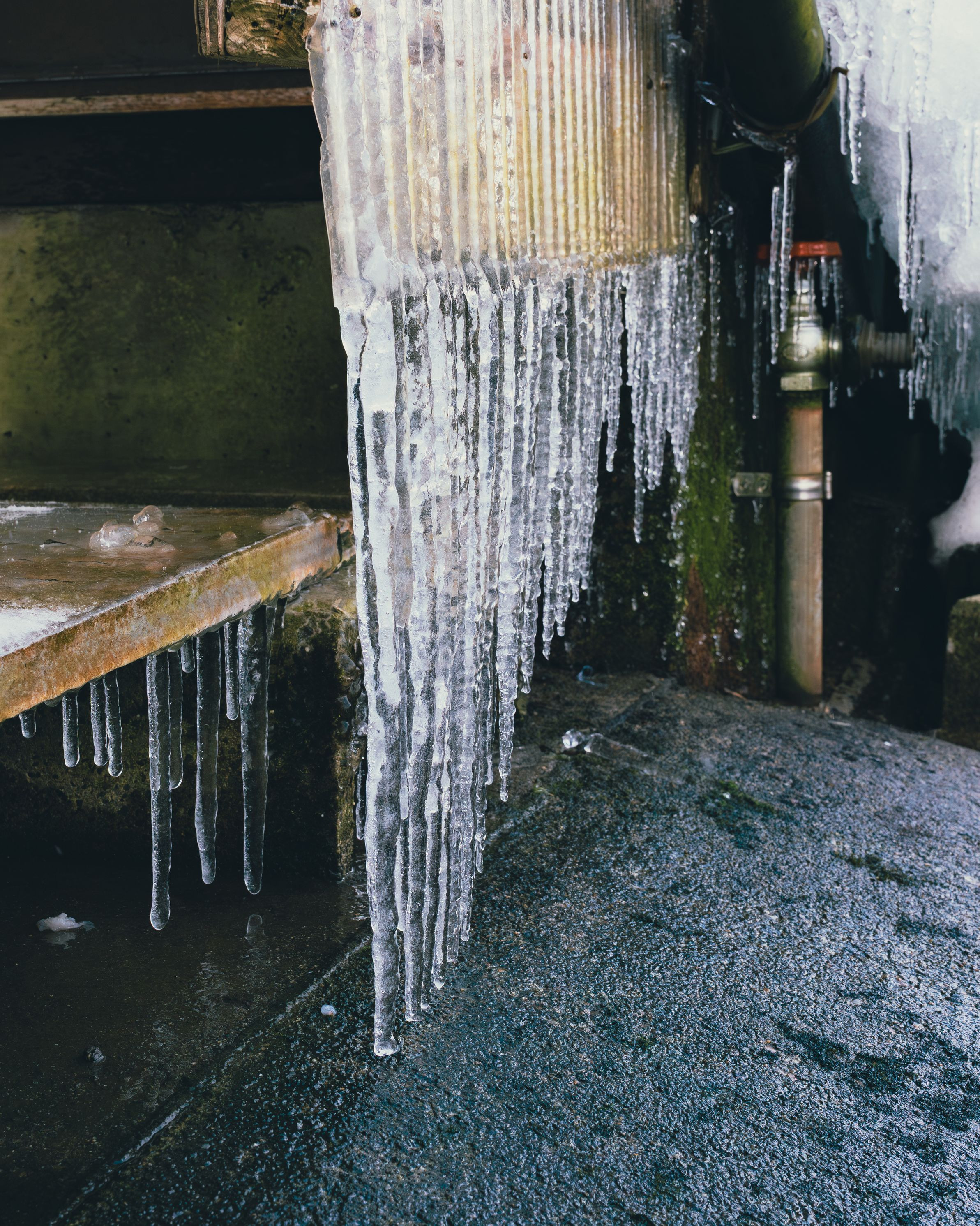 勝手口の波板に付いた水が凍ってつららになり、溝に沿って整列してました。