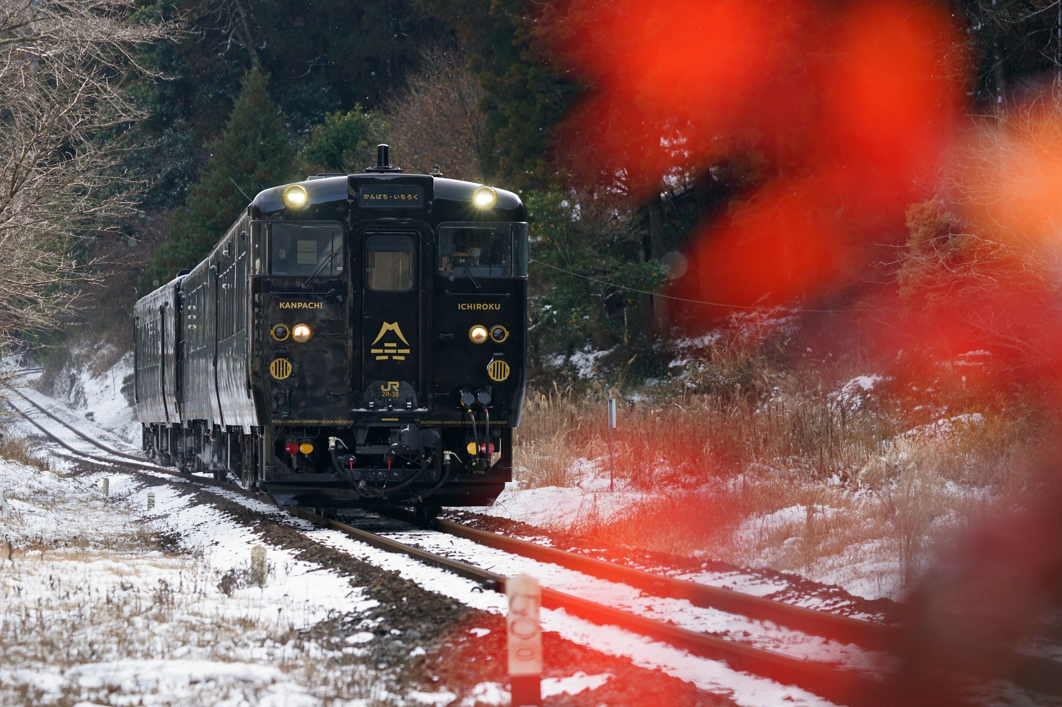 久大本線豊後中川駅の植木の赤が印象的だったので、雪が積もった久大本線を走る、観光列車「かんぱち・いちろく」号を撮影してみました。
