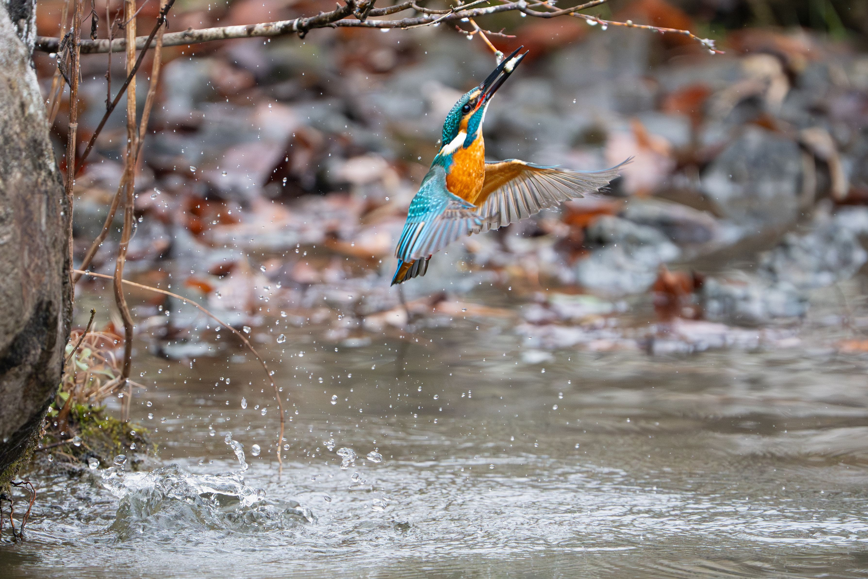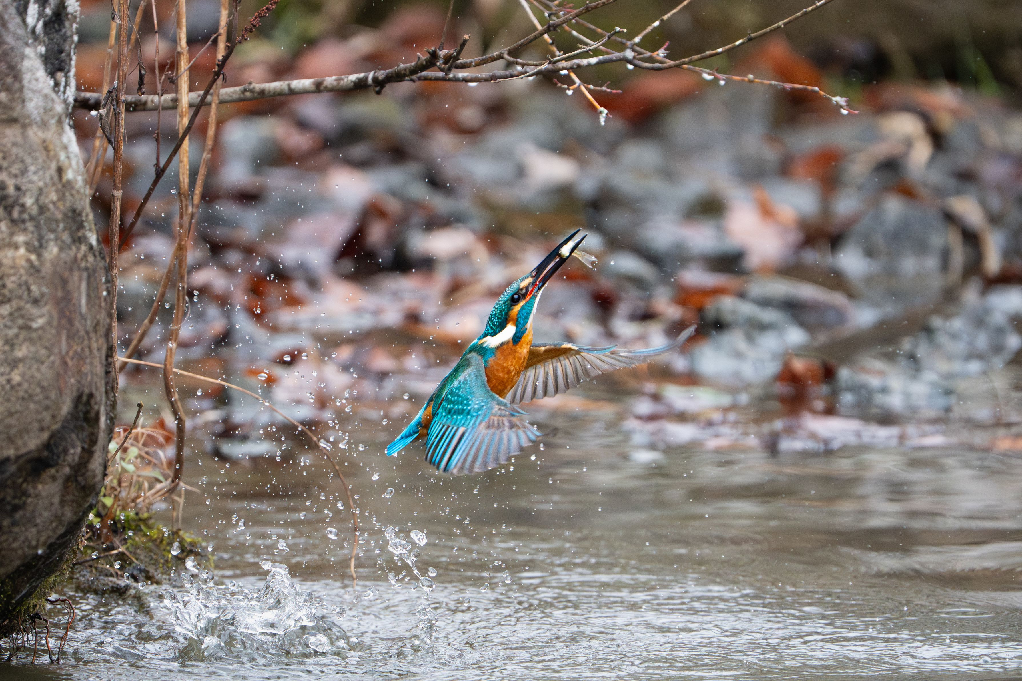南関東に雪が積もった日。いつもの公園。 「滑って大切な機材を落としてはならない(笑)」と 冬山登山用のチェーンスパイクを履いて撮影へ。 そろりそろり・・と歩きながらいつもの撮影ポイントに到着。 雪なんてお構いなしでいつも通りバシャバシャ飛び込んで お魚をゲットしていたカワセミくんでした。 今日もありがとう(╹◡╹)