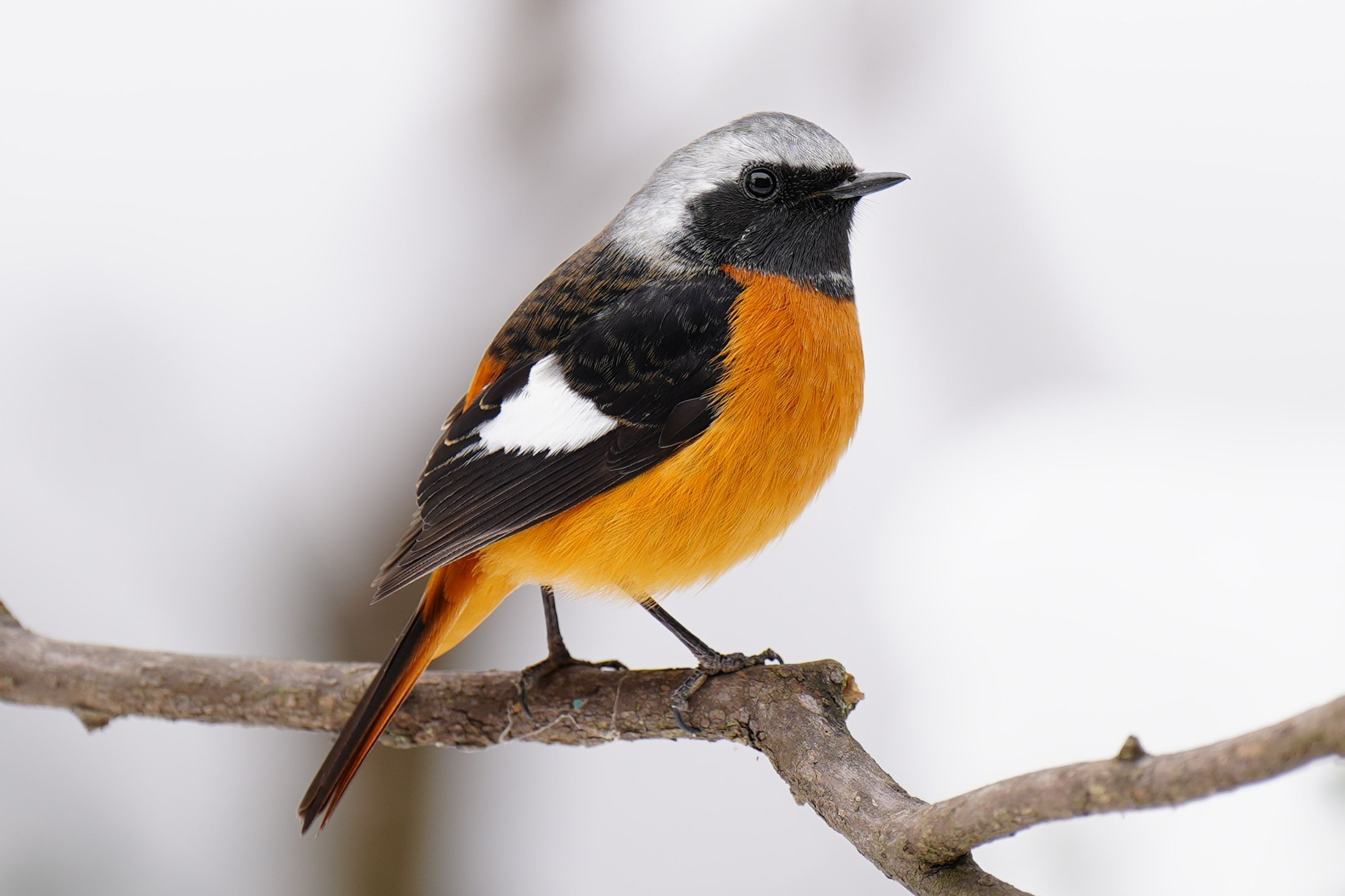 真っ白な雪を背景にオレンジ色が映えるジョウビタキ
