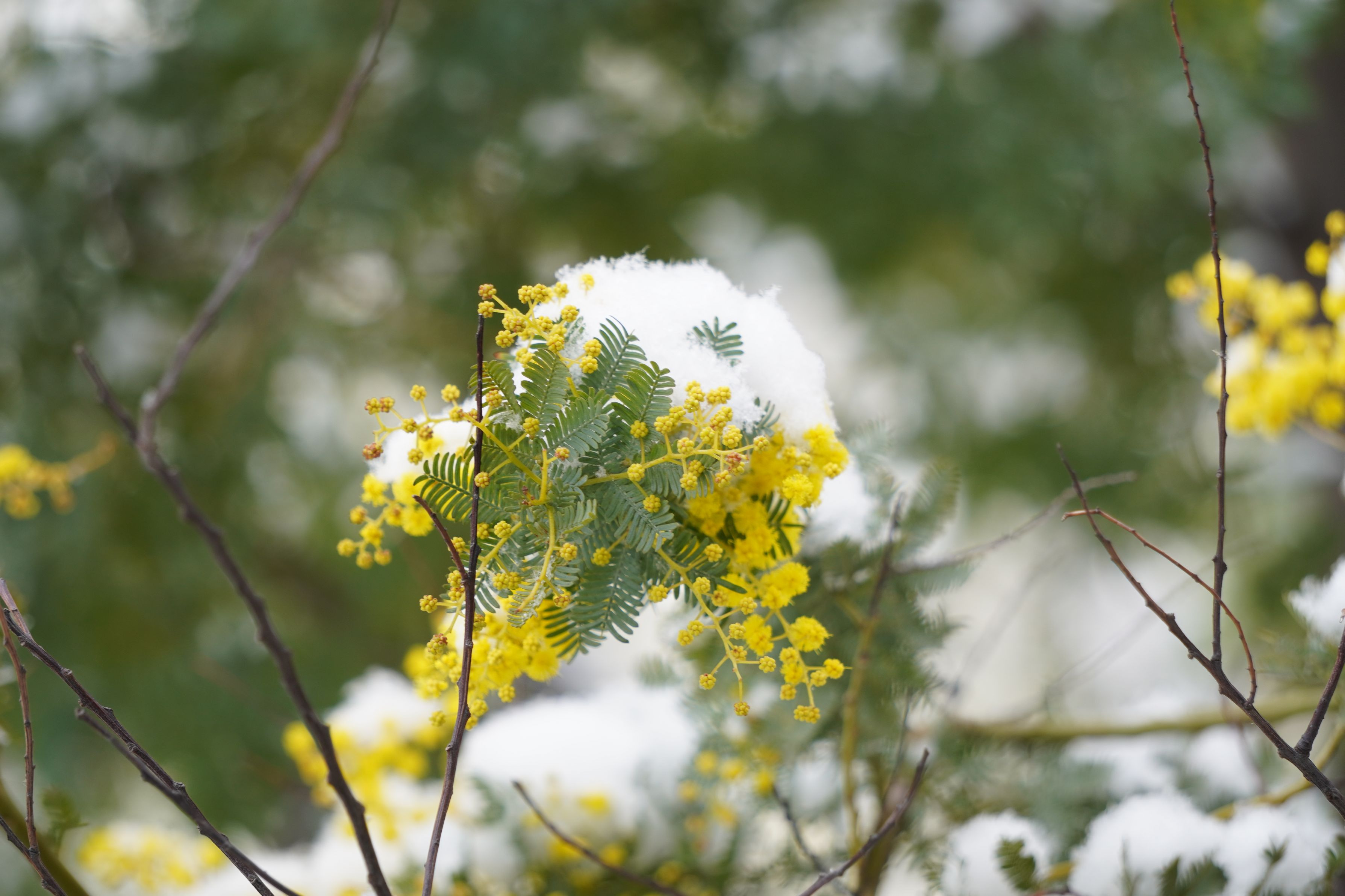 毎年撮るミモザ。今年は雪の帽子かぶったミモザが撮れました