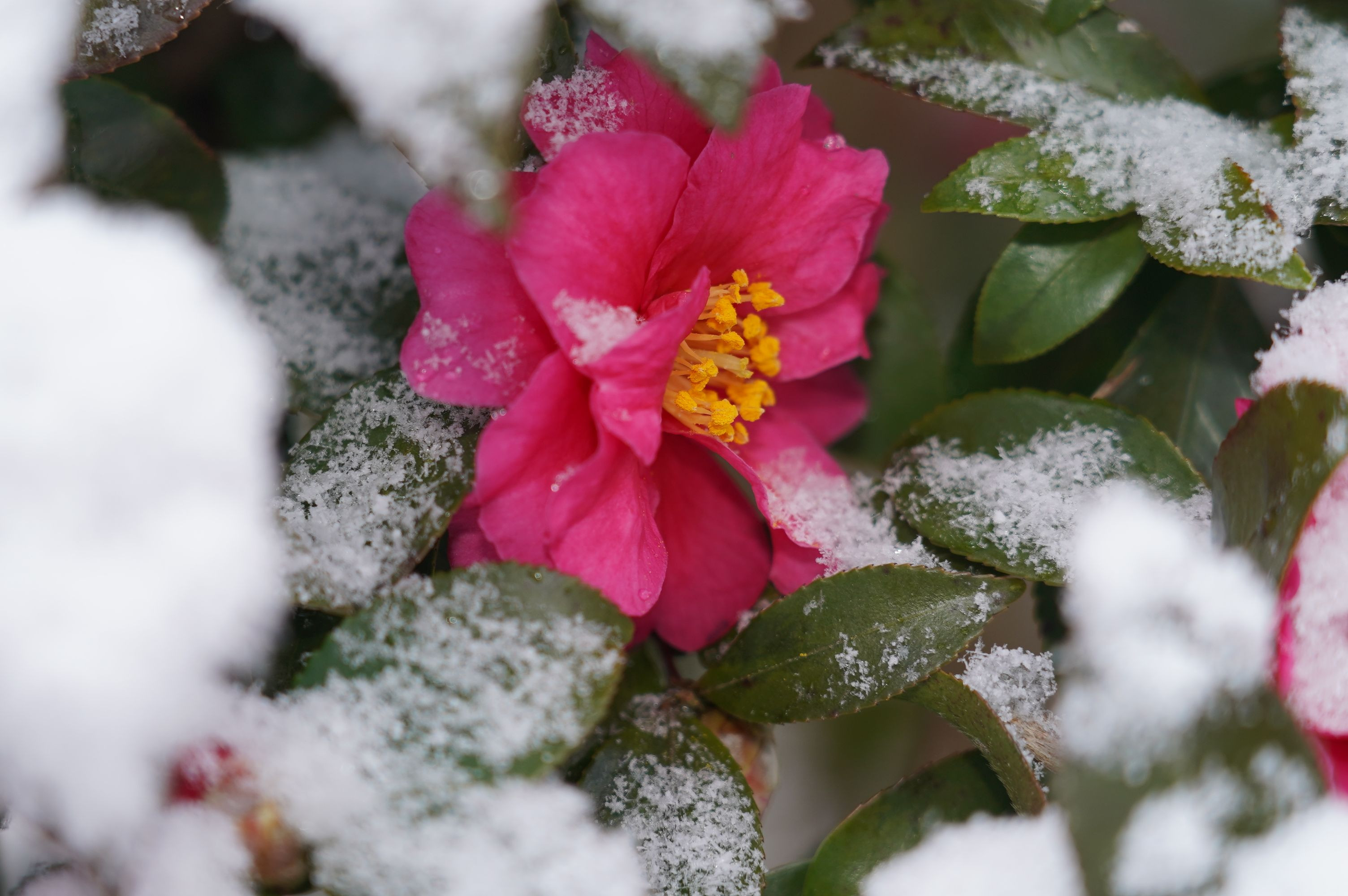 積もった雪の中に赤いサザンカが控えめに咲いているようでした。