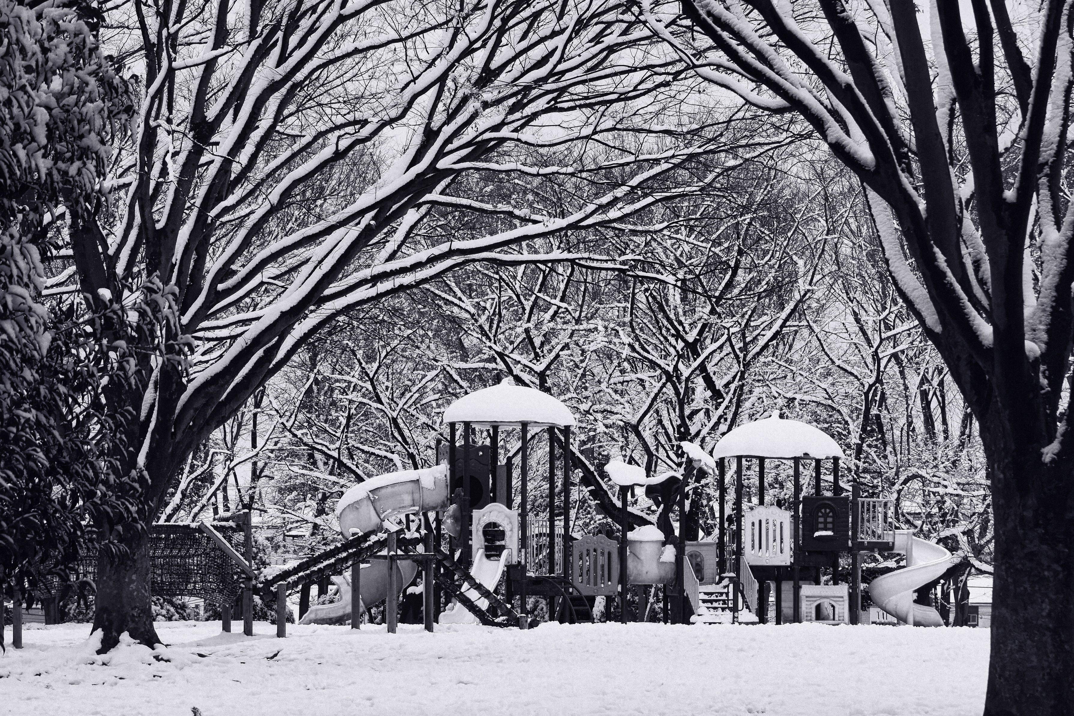 2/8:衆議院選挙投票日、投票所の帰りに近くの公園へ行くと たくさんの子供たちが雪だるま作りを楽しんでいました。 いつもは賑わう遊具には誰もいない