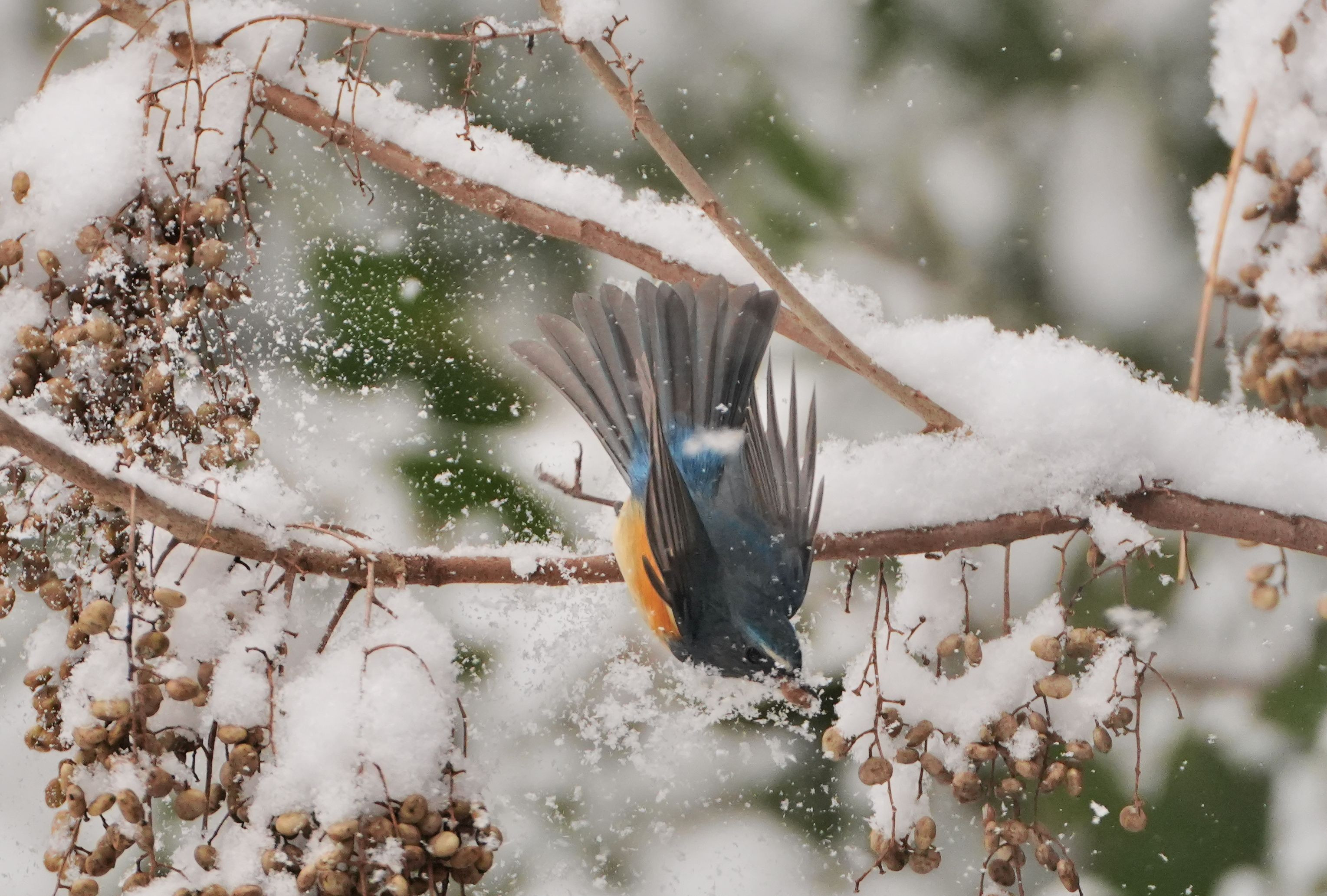 ルリビタキ♂ 雪の積もったハゼの実をゲット