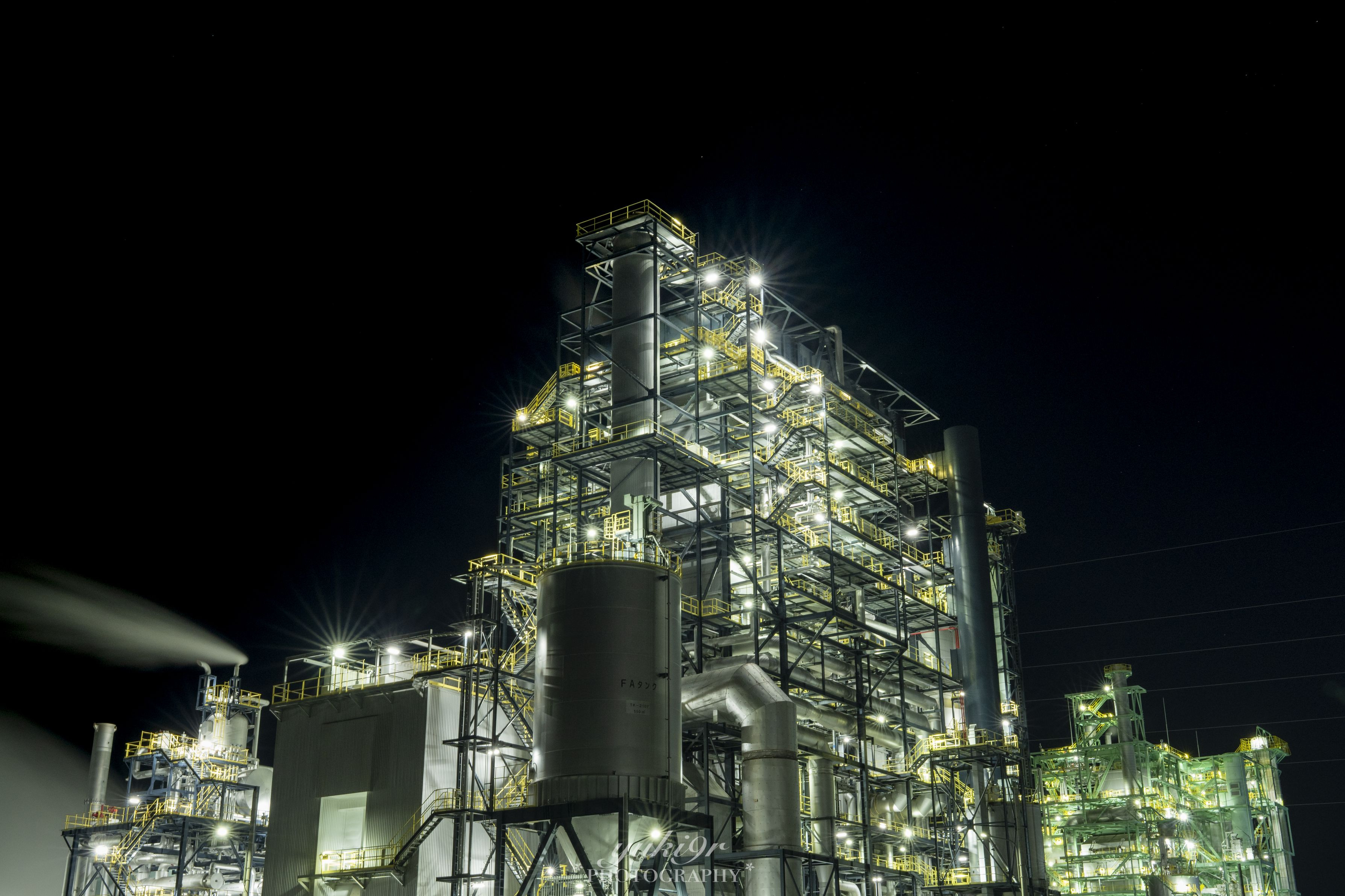 光に縁取られた配管と鉄骨、白い灯りが規則正しく並び、昼とはまったく違う表情を見せてくれる