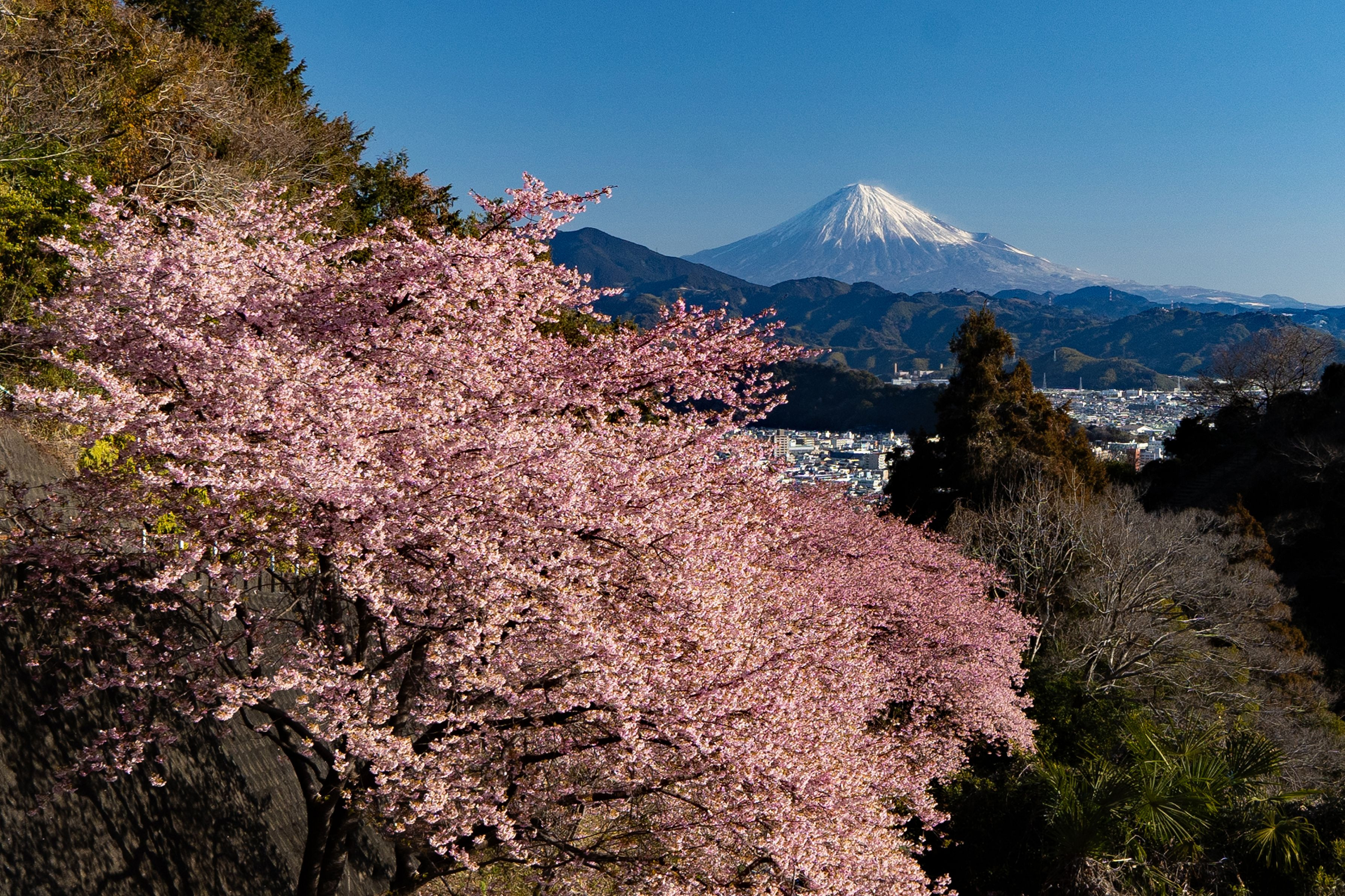 静岡の里山に咲くほぼ満開の河津桜🌸 その向こうの白雪の富士が美しかった!
