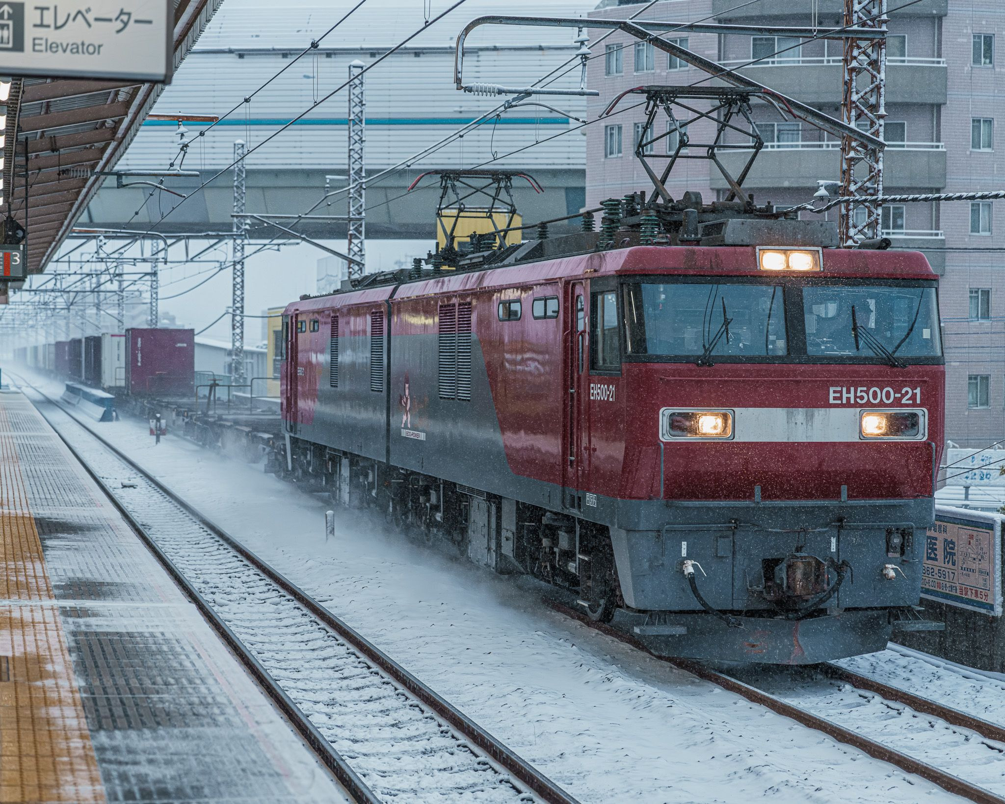 関東圏では雪が降るのも珍しいのでそこを狙って普段、見ることのない雪の中での 貨物列車を記録するために、駅ホームで撮影。 4089列車 EH500-21号機