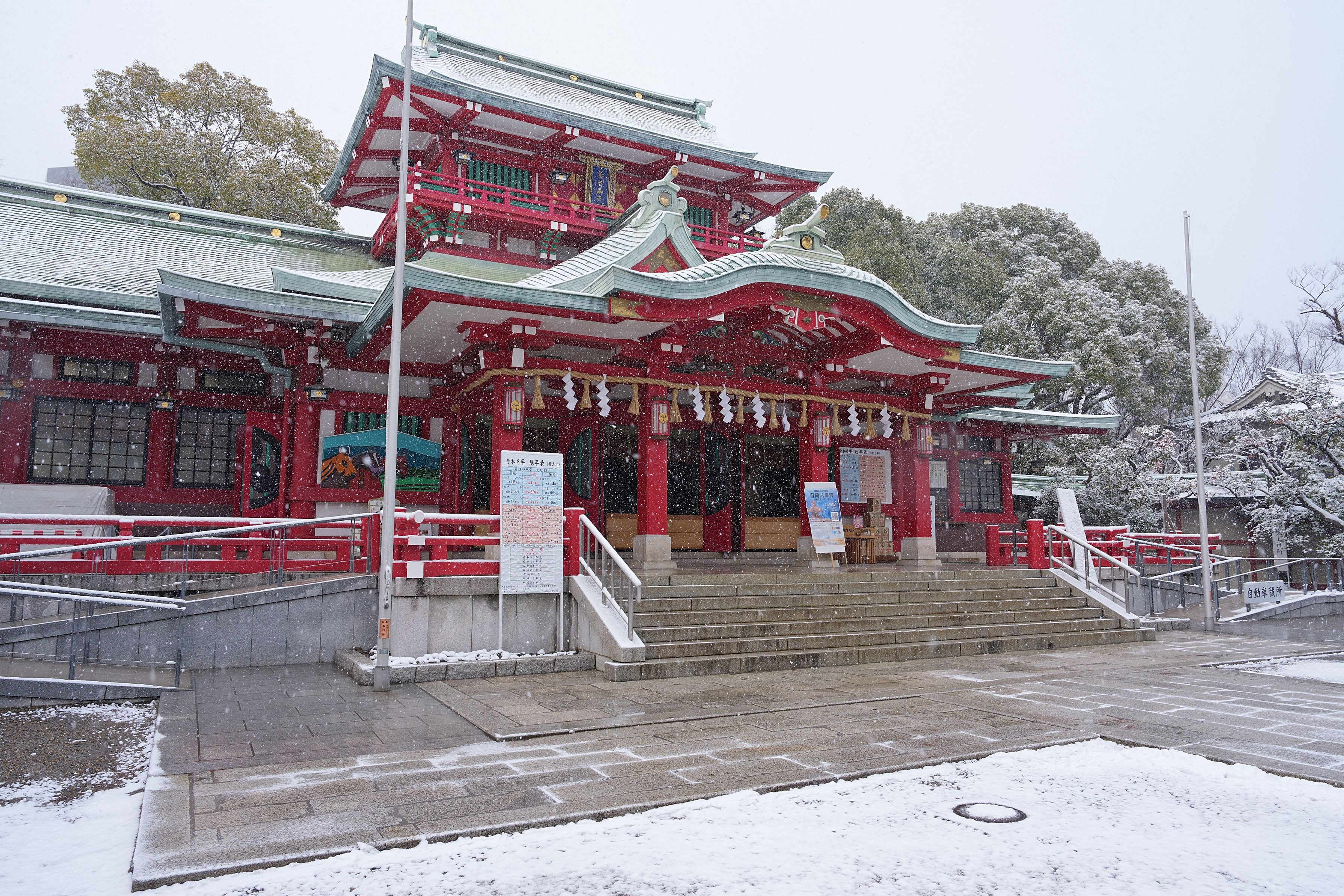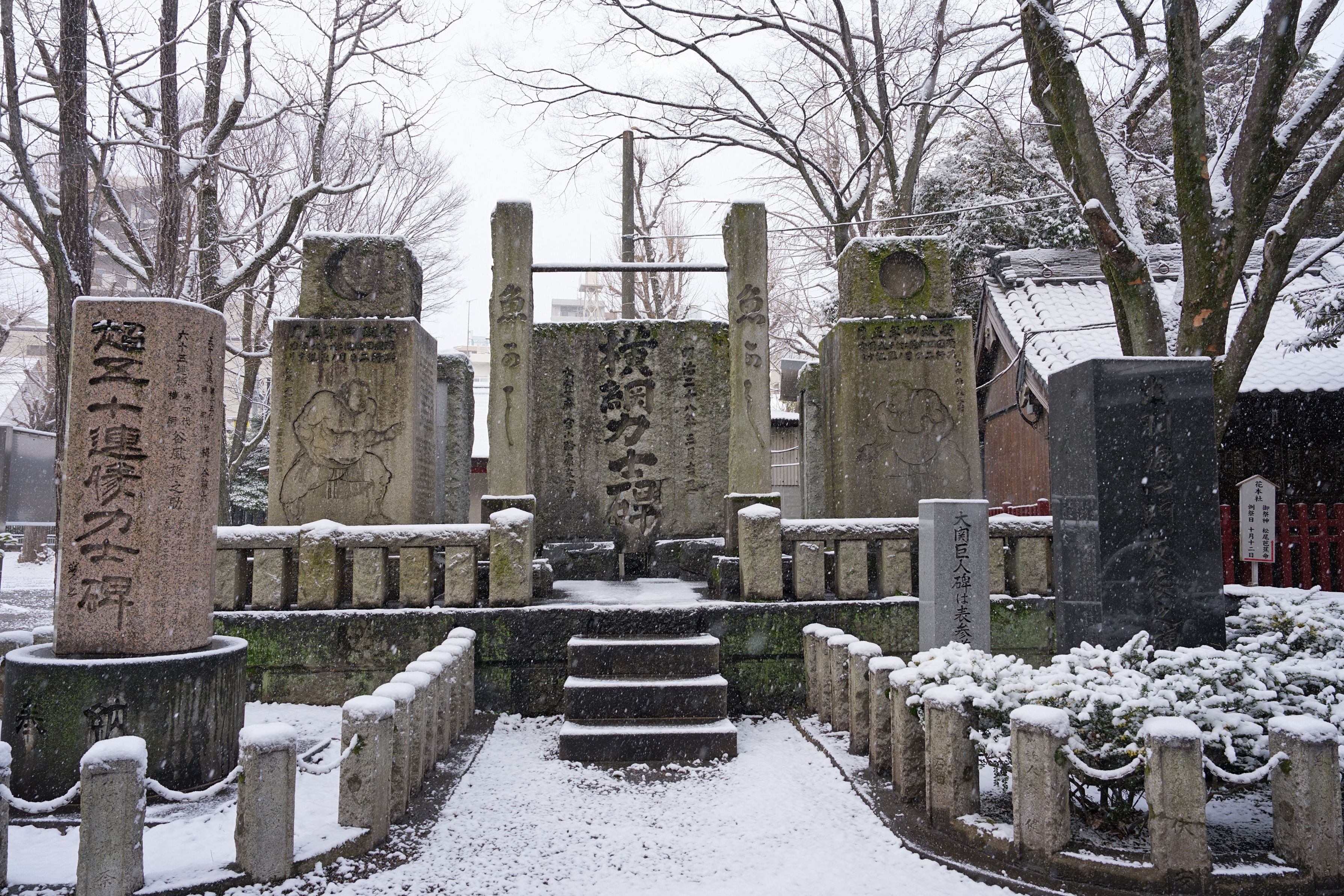 富岡八幡宮の境内にある「横綱力士碑」 雪の降る中も力強く存在感を示しています。 2枚目は雪化粧の富岡八幡宮です。