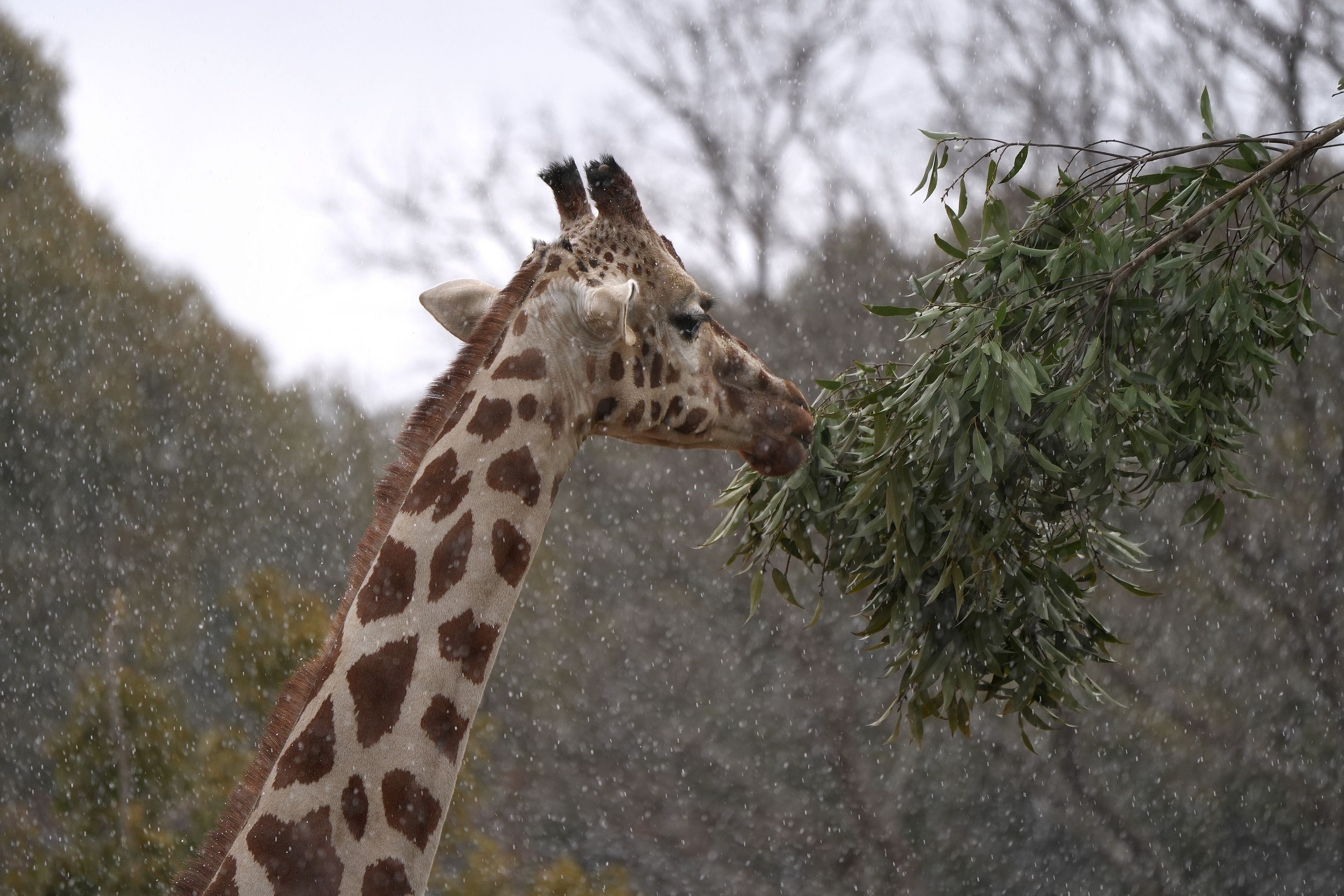 雪と○○その2 雪の中というイメージがあまりないようなキリンを撮影できました。雪の降る中エサを元気に食べていました。