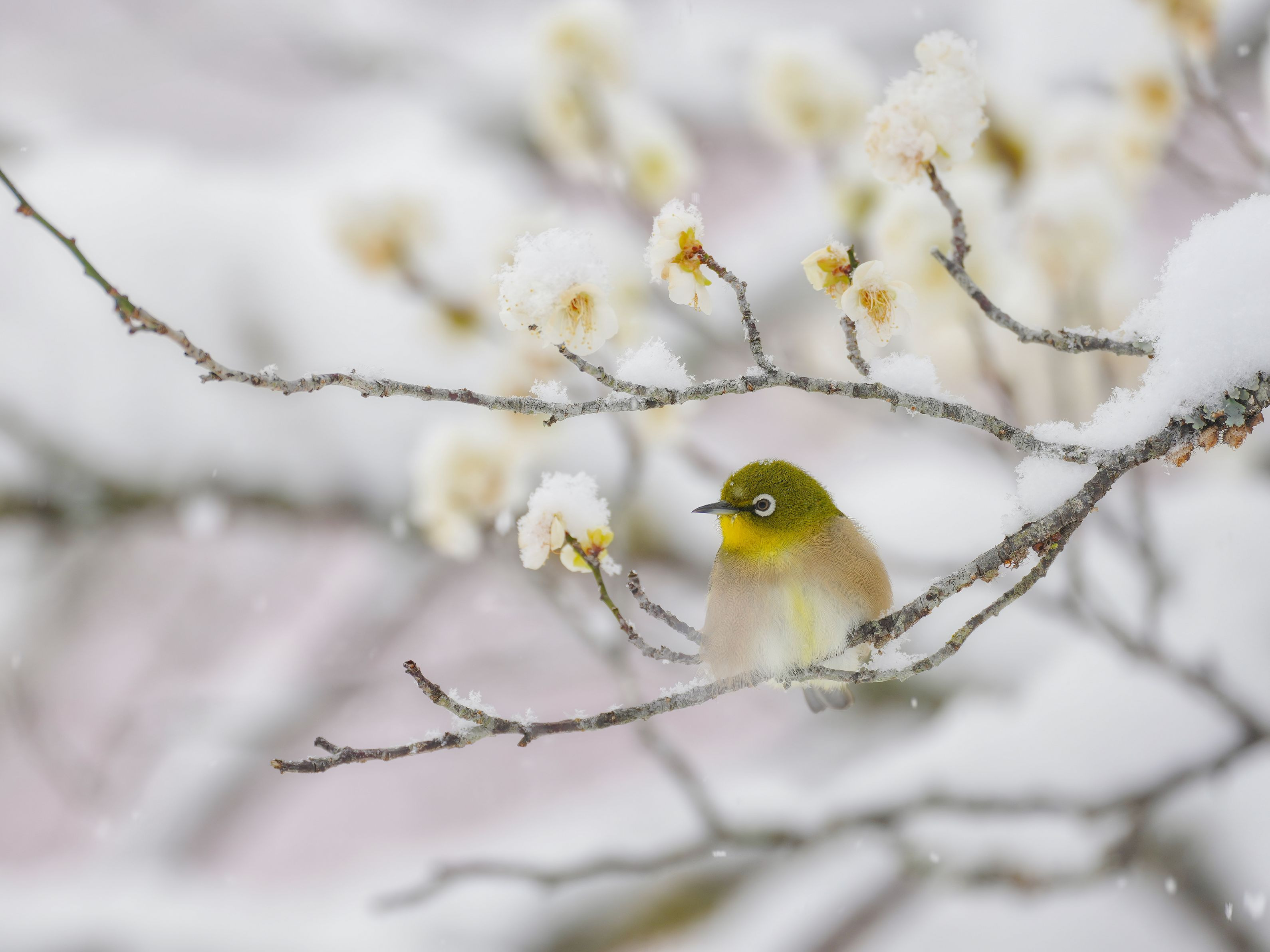 2026年2月 梅林にいたメジロさん 雪が降る中まん丸になってじっとしていました✨ #メジロ#