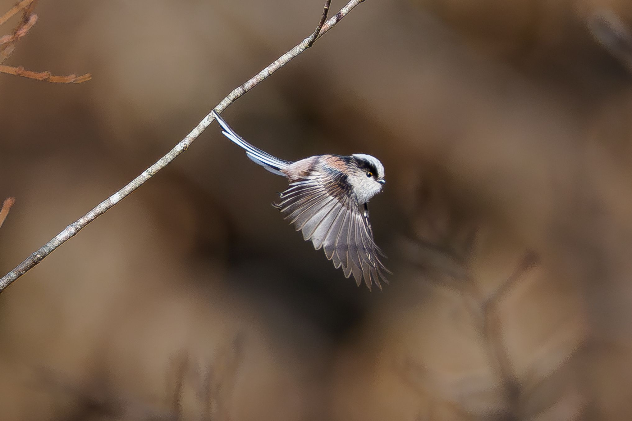 オオタカの撮影を狙って待っていた所の近くにエナガ、コゲラ、メジロの混群が見えたので、エナガに狙いを定めて撮りました。エナガが他の枝に飛び移るため飛び出したところです。
