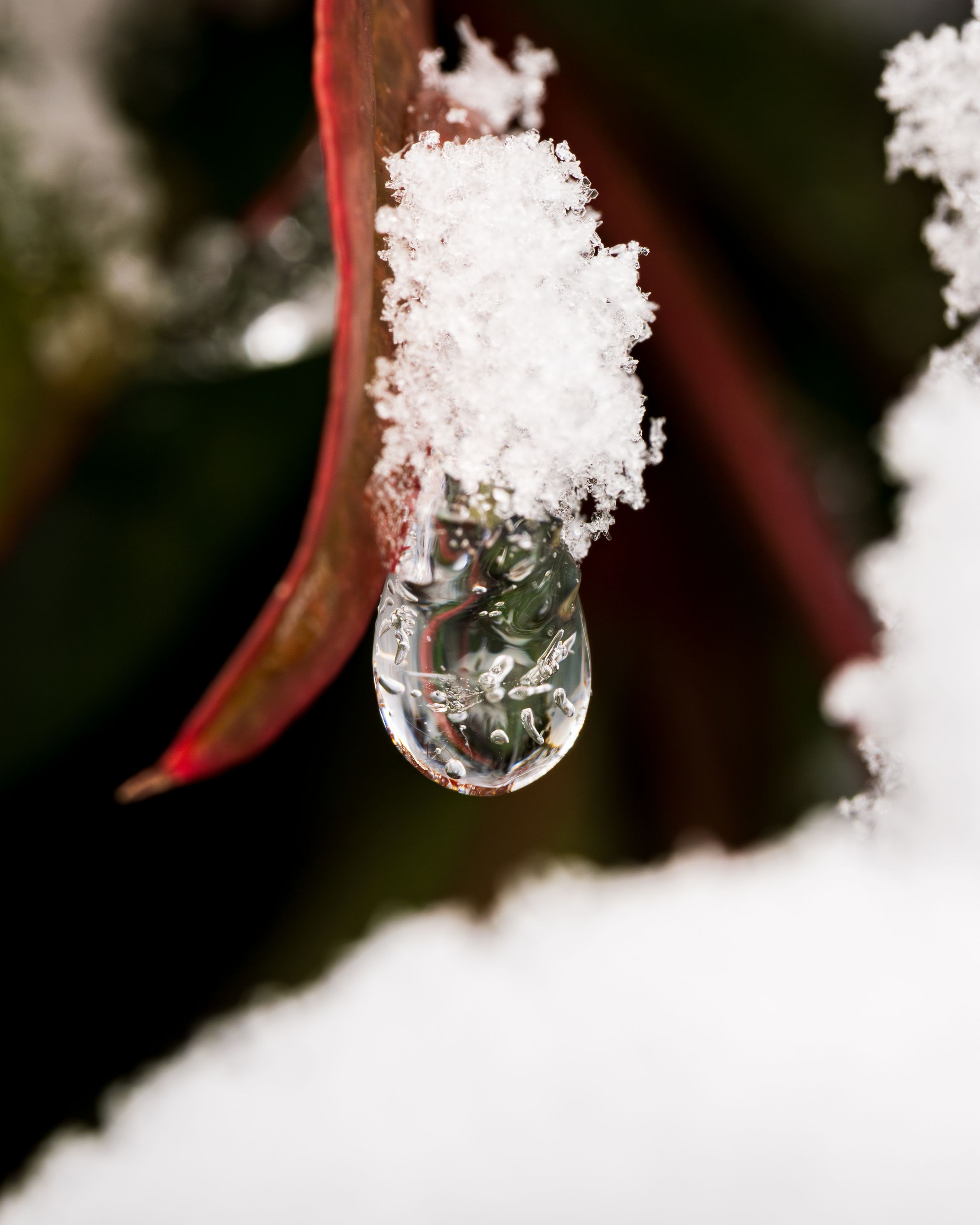 ナンテンの葉にぶら下がった氷の雫に雪が積もっていました。