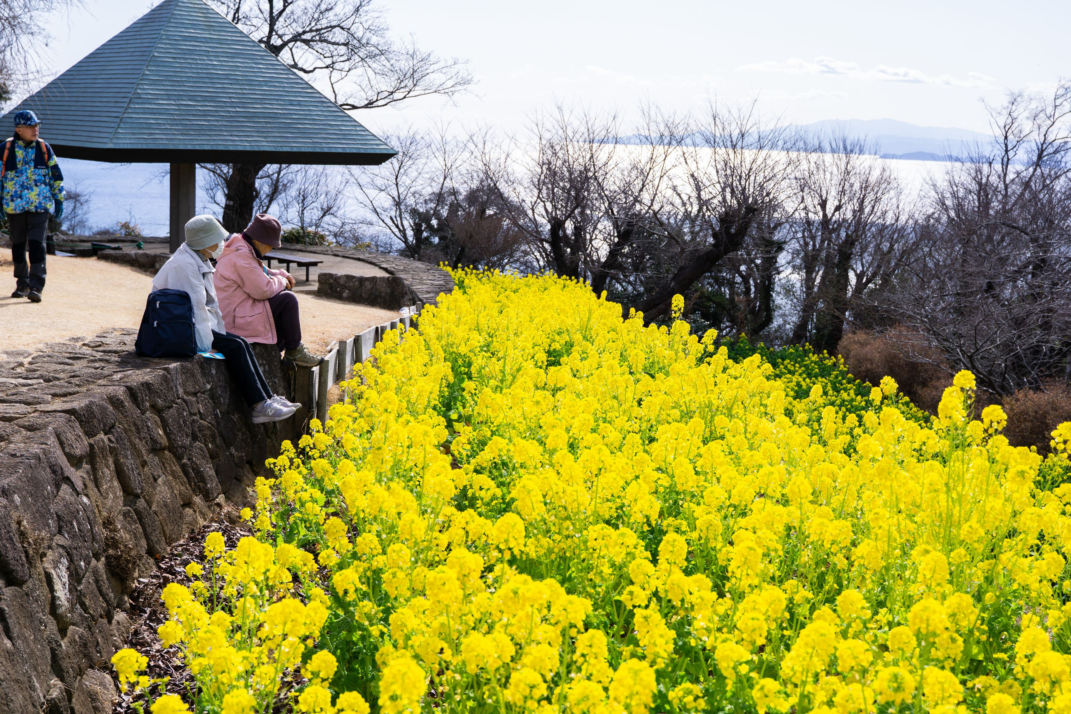 吾妻山公園の山頂に咲く菜の花を撮影しました。遠くに海が見えます。