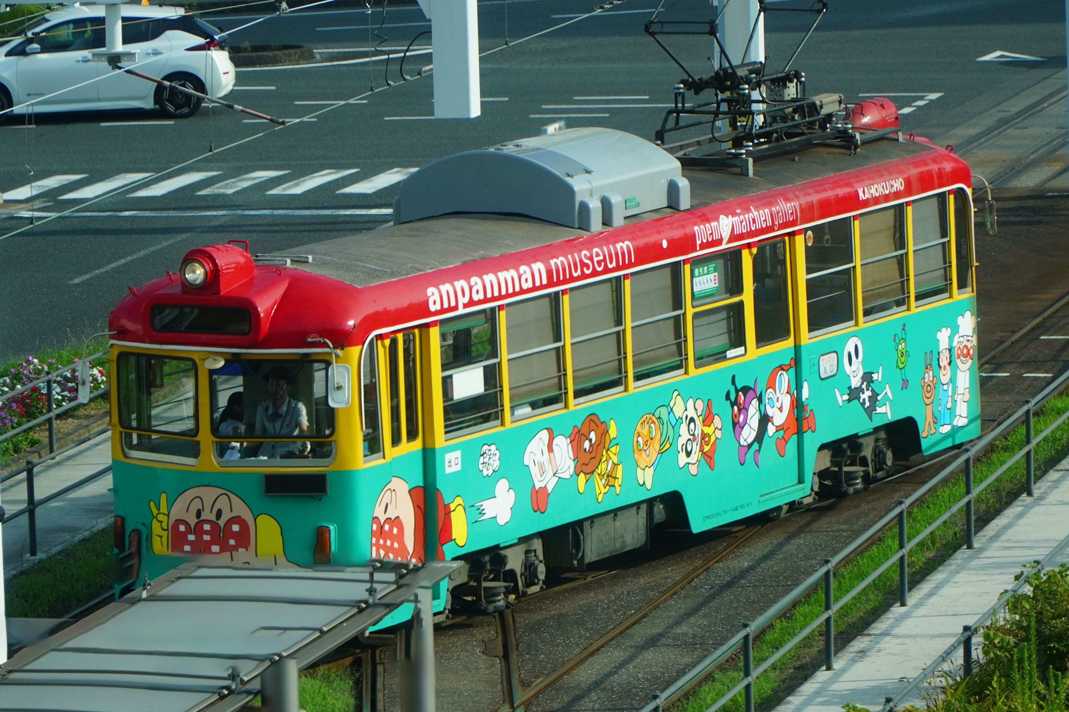 高知を走る路面電車にアンパンマンとキャラクターたちがいました。