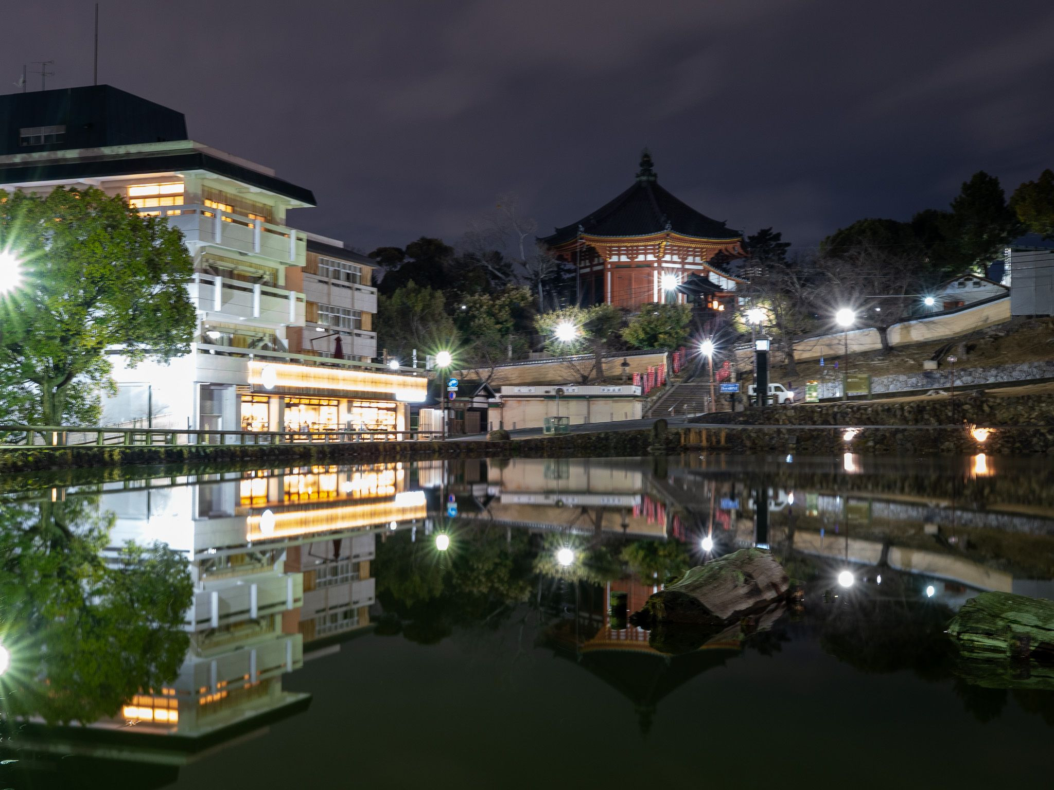 夜の猿沢池。 灯りに照らされた街と伽藍が、 静かな水面にそのまま映り込む。 動きの止まった奈良の時間を切り取りました。