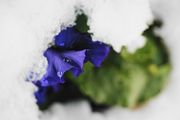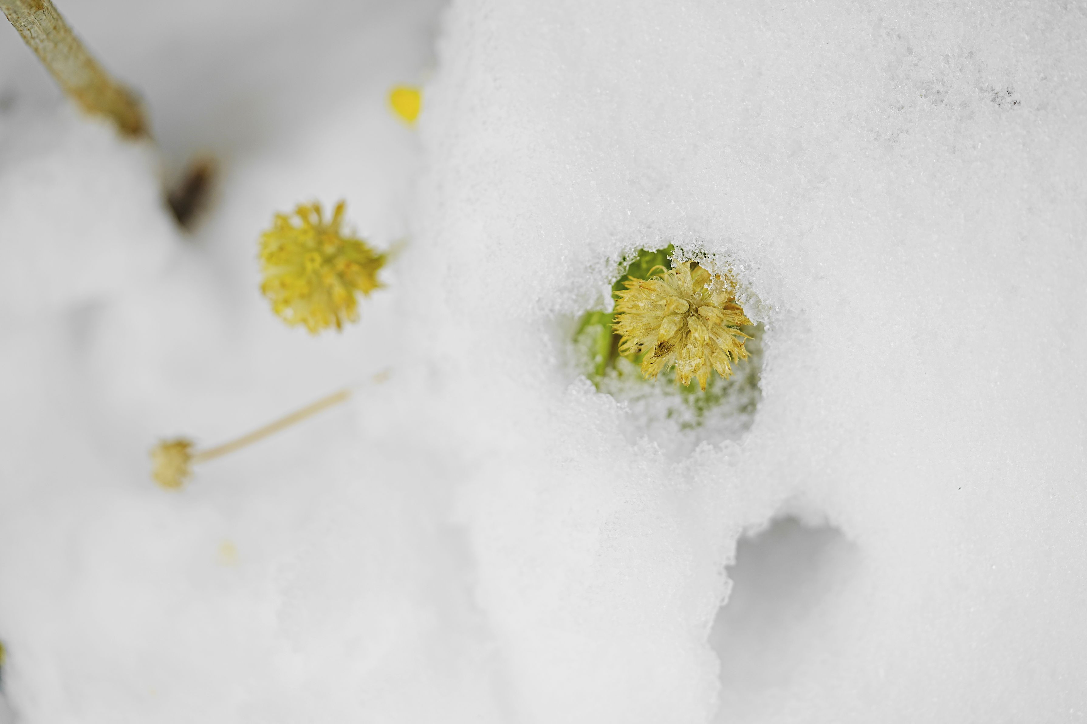 まるで雪洞シェルター。前日は終日横殴りの雪。夜半に止んで、朝はすっぽり雪の中だった花たち。昼前です。