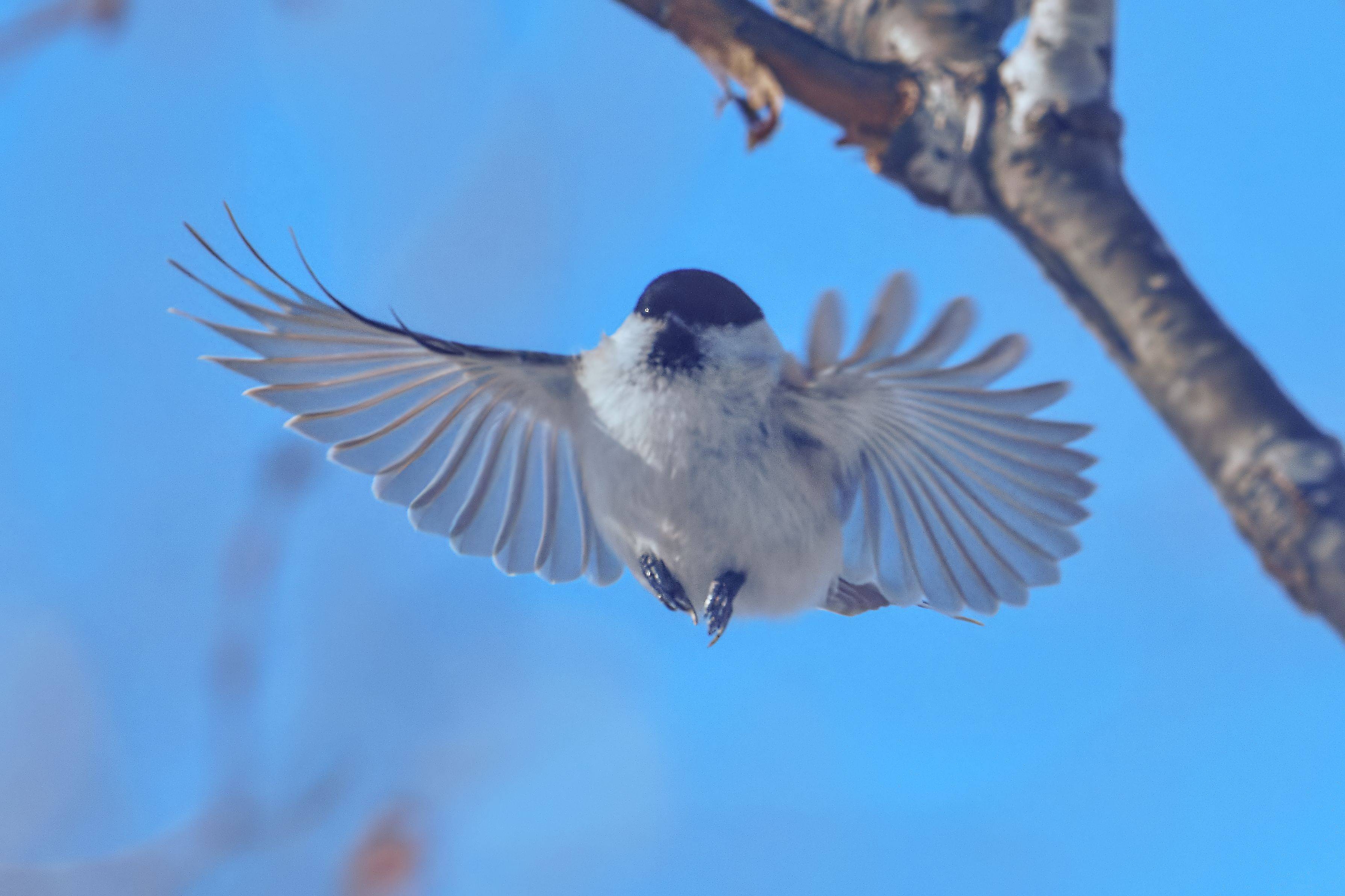 シマエナガ同様、冬はモフモフで可愛いハシブトガラさんの羽ばたきです。