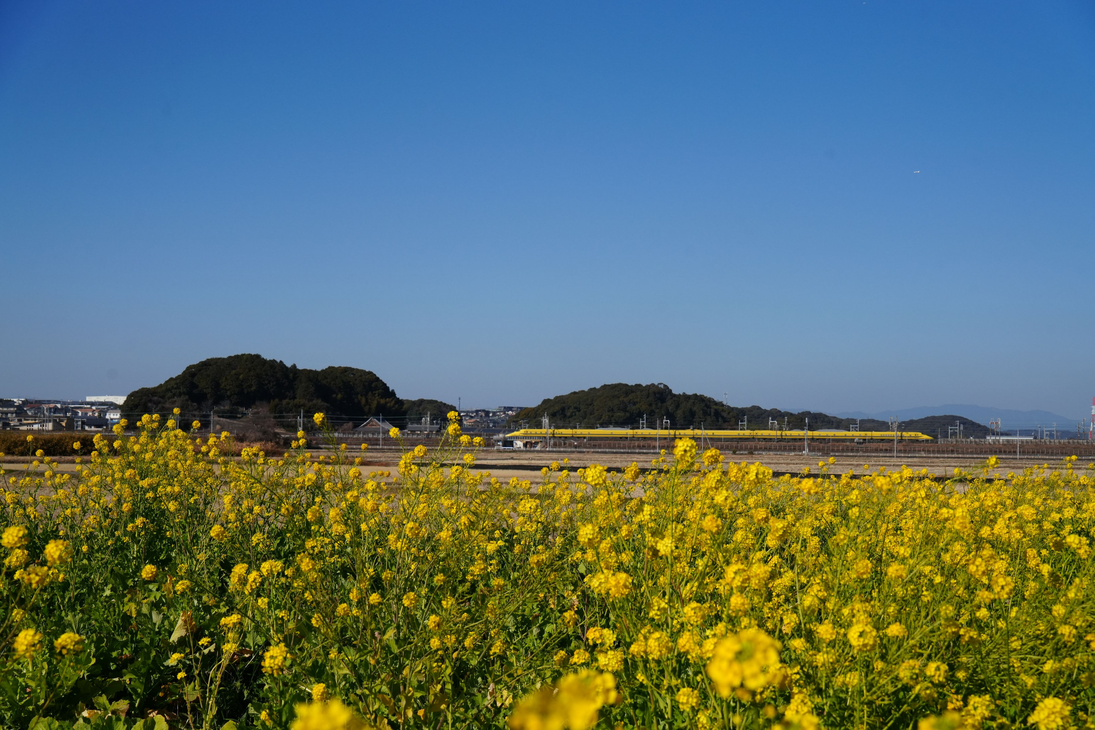 菜の花の向こうに通過するドクターイエロー