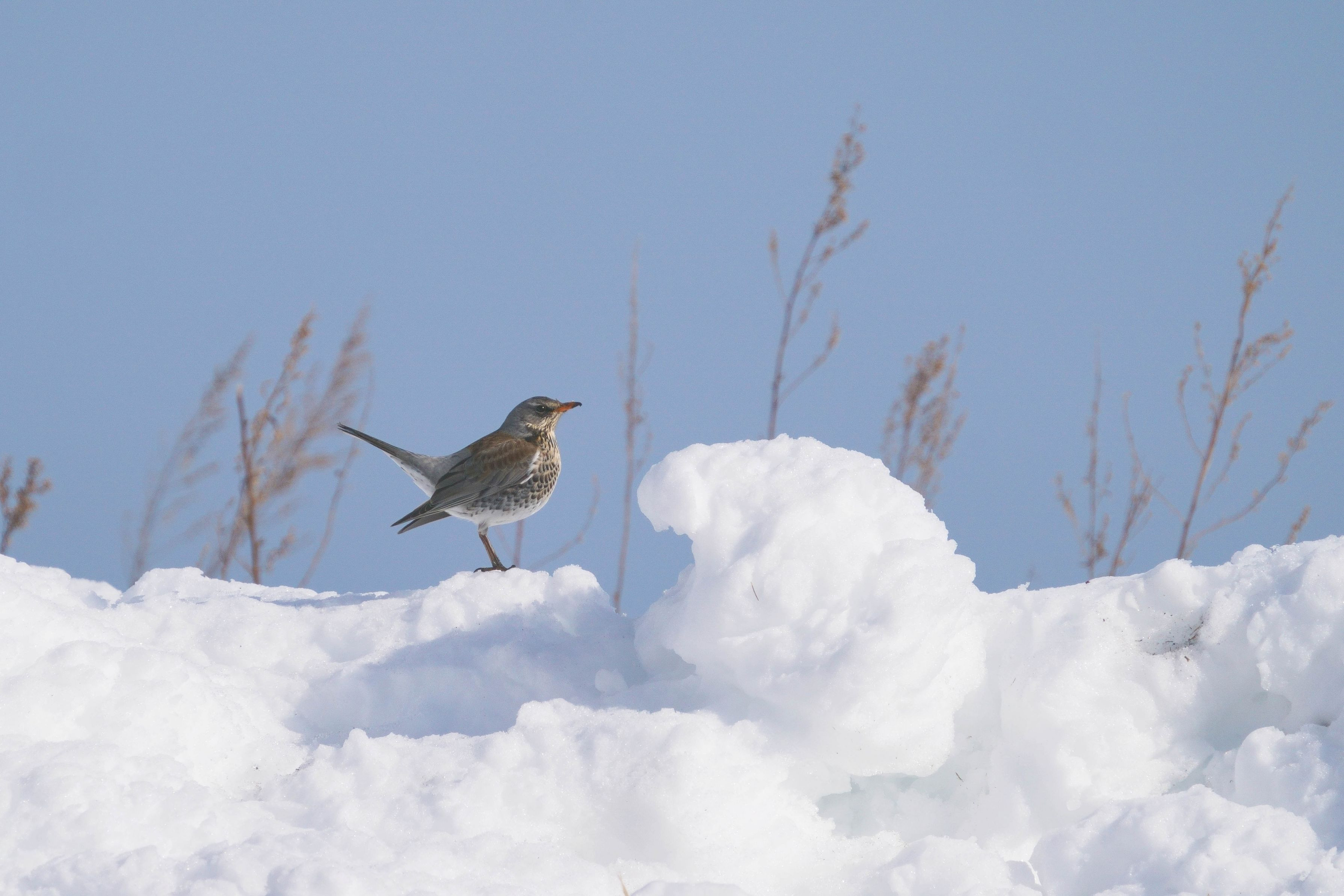 真冬の雪原で、ノハラツグミに出会いました。