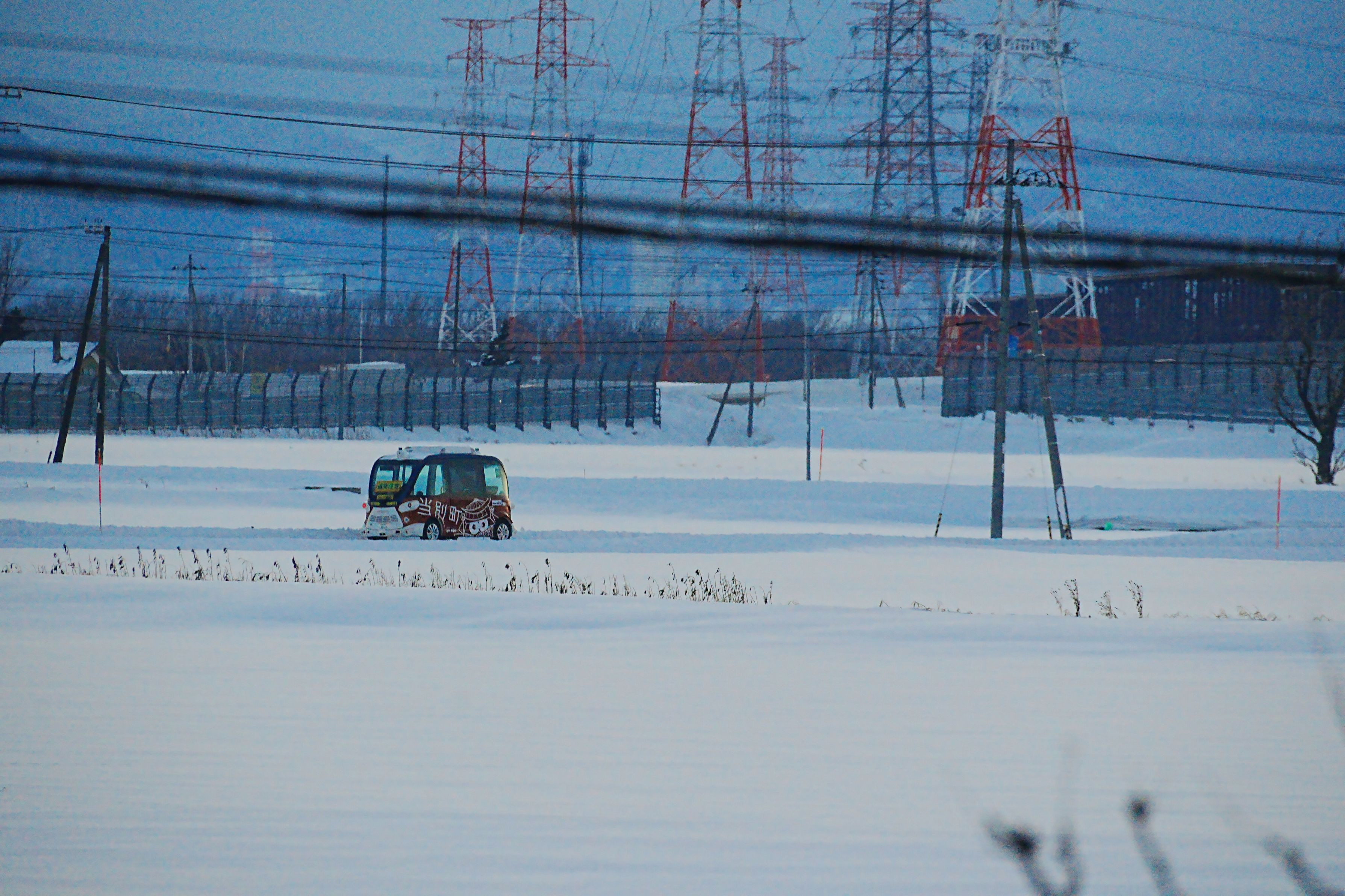 雪景色の中、可愛い自動運転カーが走っていました😊