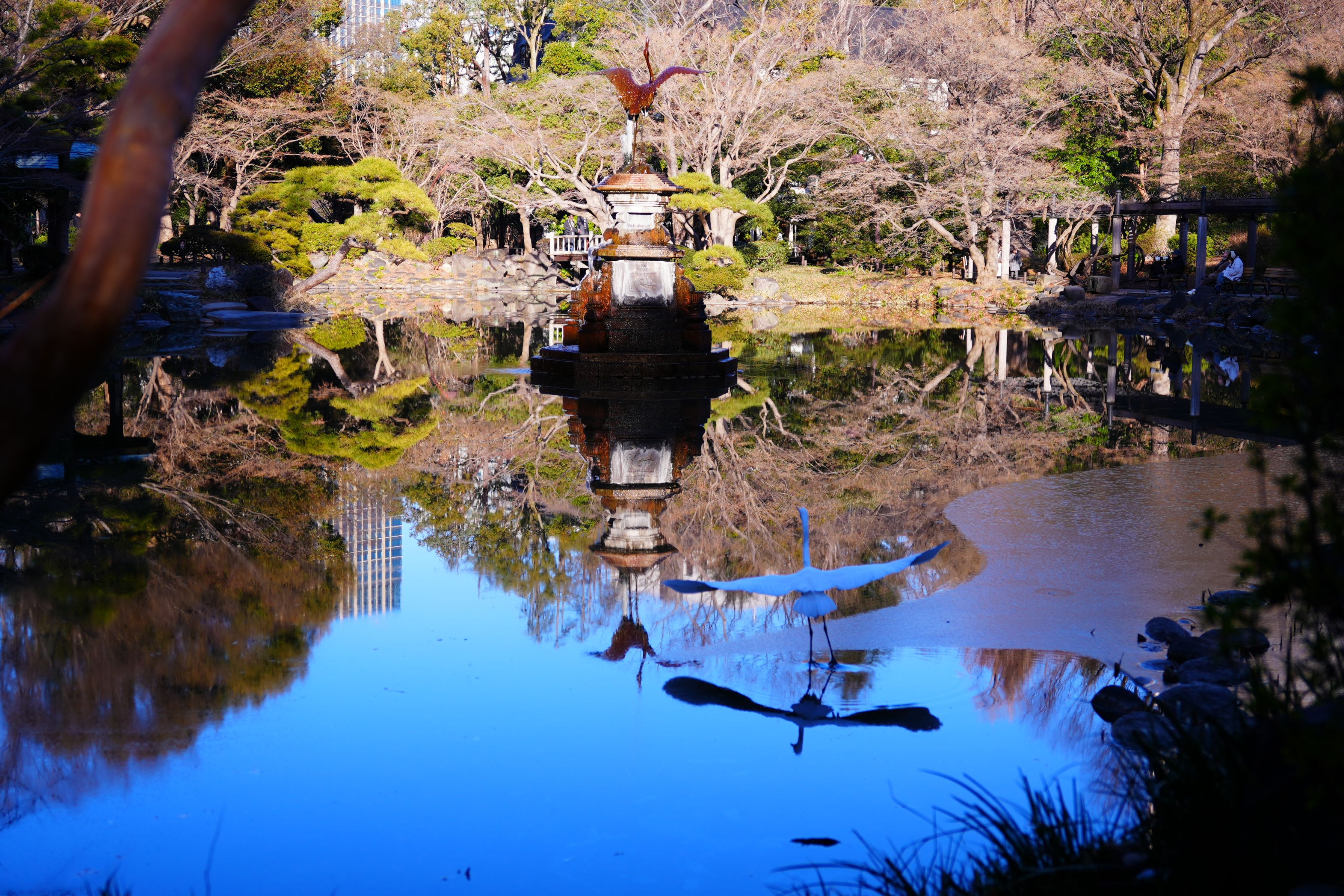 日比谷公園の鶴の噴水です。 見ていたら白鷺が近づいてきました。