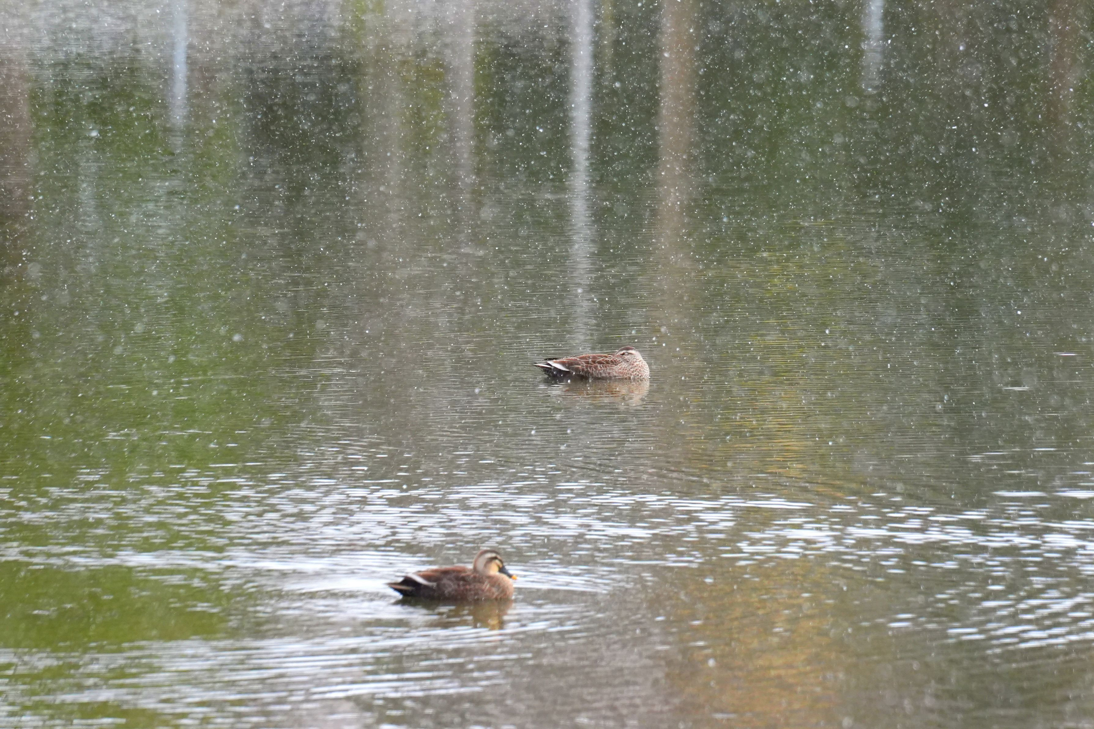 雪の降る池を行くカモ